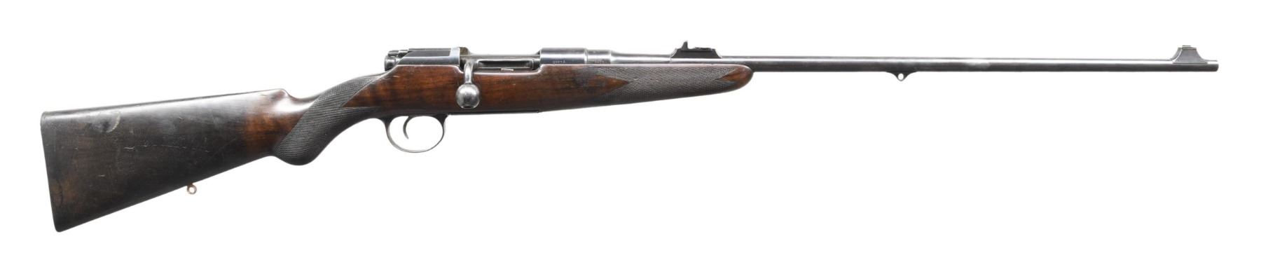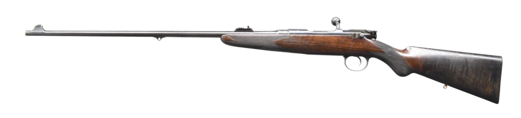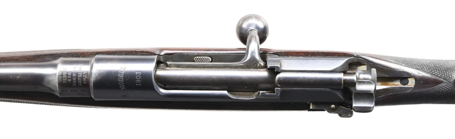 ACTION RIFLE. Cal. 256 Gibbs Magnum. S# 2987A. Gibbs # B5363 (on trigger guard bow). # B4820 (on barrel). George Gibbs made a fair number of these rifles at the turn of the century and they were quite popular as a general purpose rifle in Africa and few are found in fine condition. This example exhibiting most of its original finish has 26" barrel fitted with express and two leaf rear and silver bead front sights, both in raised blocks. British proofs are at rear along with "FOR" "GIBBS" ".256" "MAGNUM" "CARTRIDGE" "ONLY" (The 256 Gibbs had a larger case than the standard M.S. cartridge with ballistics similar to the 6.5 x 55 Swedish). Mannlicher Schoenaur action is marked "MODELL" "1903" on receiver ring and "STEYR 1906" on sidewall. Bolt has turned down handle with large hollow knob. Gibbs #B5363 is on bolt root. Stock with round knob pistol grip is of lightly figured European walnut and measures 14-5/16" over steel buttplate. Well cut checkering is present at grip and around forend. A sling eye is on toeline. CONDITION: fine. Metal parts retaining over 80% original blue. Wood retains most of its original finish. About 9" of the butt appears to have been submerged in wet environment. Wood has darkened, buttplate and sling eye are rusted. Bore is very fine; shiny throughout. Mechanically fine. A classic British rifle. (24-4146/MGM). CURIO. $1,200-2,500.