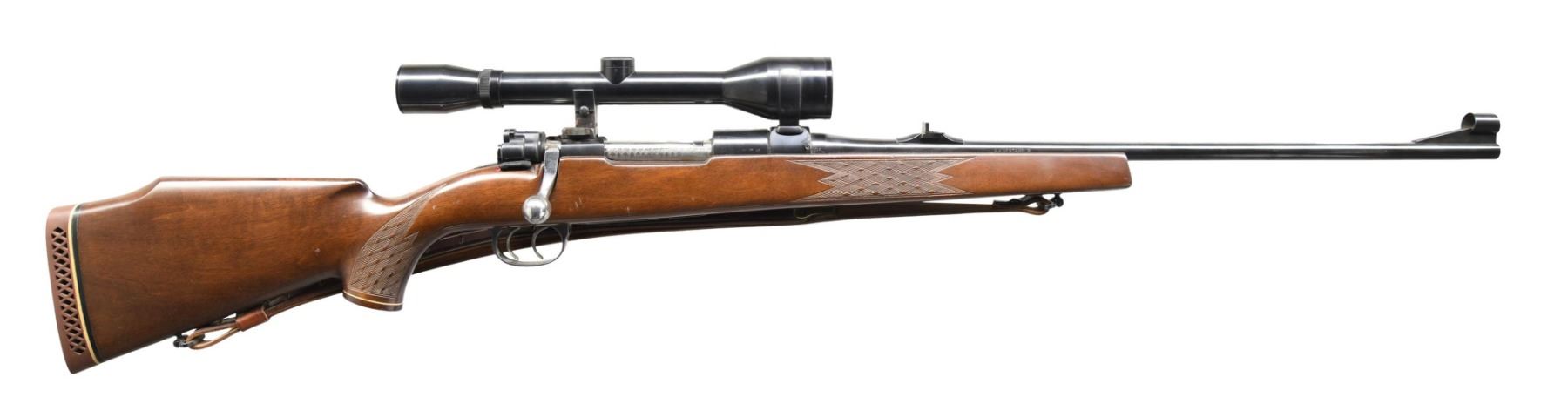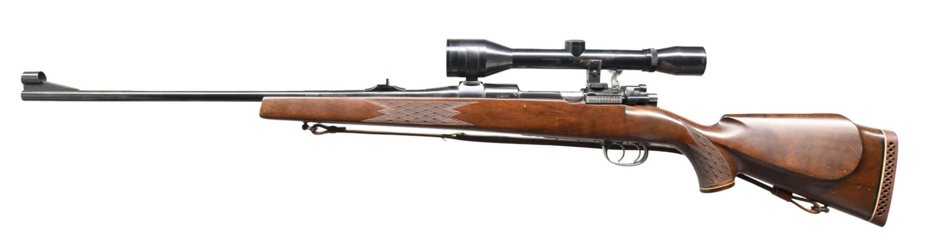 Cal. 30-06. S# 134340. Bbl. 24" Lauf Stahl. Hooded bead front sight. Flip up rear sight. Receiver-mounted Geco 6x power scope with post reticle and fair optics. Scope body shows some scattered oxidation. Post-war Voere made Mauser 98-style bolt-action rifle. Double-set triggers. Blued finish with jeweled extractor. Walnut Monte Carlo stock with left side cheekpiece and Case Works Reactive recoil pad. LOP: 14 1/2". Bottom-mounted sling swivels with leather sling. CONDITION: stock shows scattered handling marks. Metal retains 95-97% of its original blue, with some staining on the front of the receiver and light oxidation on the bottom metal. Action functions properly when hand-cycled. Very good, bright bore. (24-5054/MJC). MODERN. $500-800.