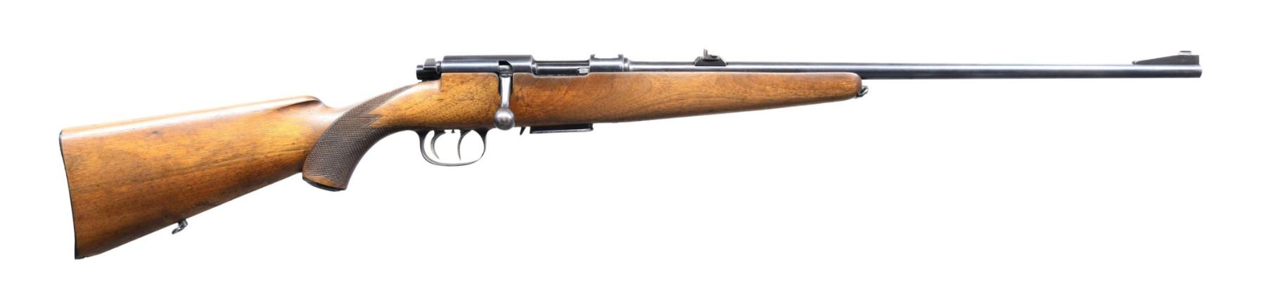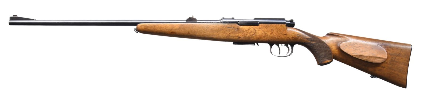ACTION RIFLE. Cal. 5.6x35R "Vierling". S# 3796 (June 1940). The 5.6x35R Vierling was a European adaptation of the 22 WCF cartridge; different than 22 Hornet (5.6x36R). Rifle has 1940 Suhl, Germany Nitro proofs on receiver & 22" barrel. Blade front sight & island 2 leaf rear sight. Receiver has large dovetail over chamber; 2 drilled holes along matted surface on top of receiver. Double set triggers. Cheekpiece walnut stock with sling swivels, checkering, grip cap & replacement basket weave buttplate. MAGS: 1 matching 5 rd. mag. CONDITION: Good blue with marks & scattered spots of patina. Fair worn wood finish with scratches, gouges, altered cheekpiece countering & chip of buttstock toe & buttplate. Bright bore with strong rifling. (24-4139/MD). CURIO. $200-400.