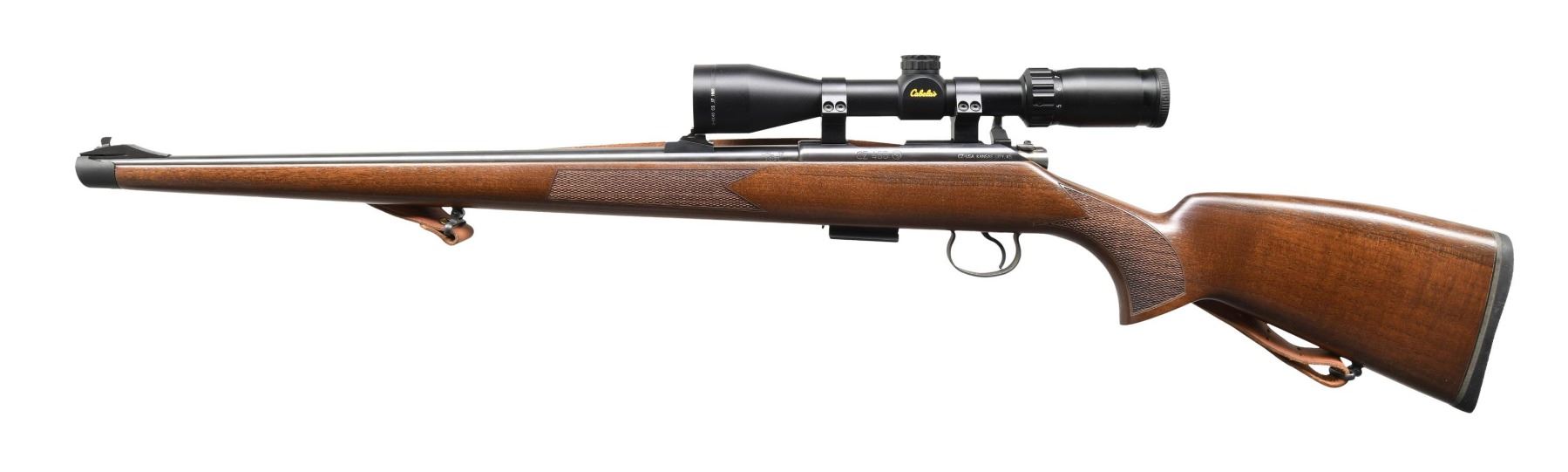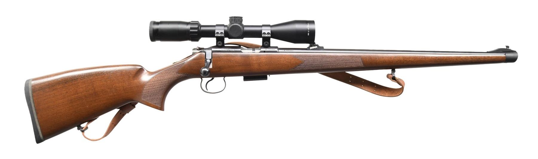 Cal. 17 HMR. S# A886865 (2011). Barrel 20.5". Blade front & Williams style receiver sight. Cabela's 3-9x40 scope with CS 17 HMR duplex reticle. Mannlicher style Turkish walnut stock set w/ sling & black recoil pad. MAGS: 1 - 5 rd. CONDITION: missing front sight hood; all other aspects near excellent including bore. (24-4569/MD). MODERN. $500-700.