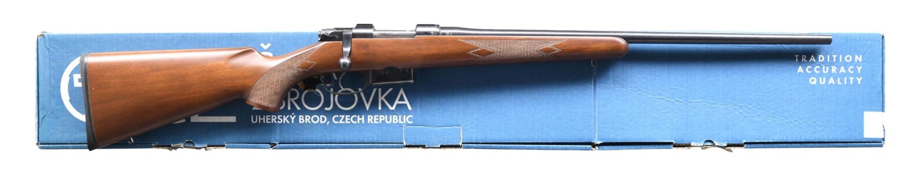 Cal. 22 Hornet. S# 98779. Bbl. 22". Rifle has no sights, but receiver has scope bases. Mfg. 2002. Blued finish. Checkered walnut pistol grip stock with bottom-mounted sling studs and Pachmayr recoil pad. LOP: 13 3/4". MAGS: one 5 rd. UNATTACHED ACCESSORIES: matching-numbered factory box in fair condition with scope rings, manual, and paperwork. CONDITION: stock shows a few light handling marks; other aspects are near excellent. (24-3742/MJC). MODERN. $400-600.