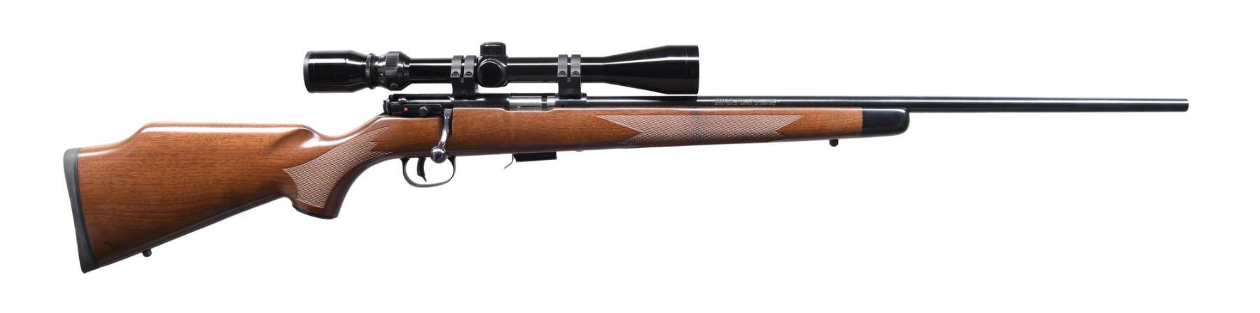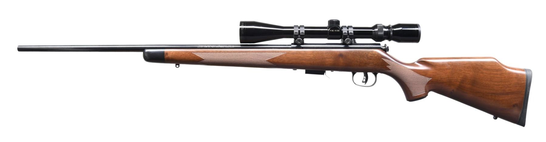 Cal. 17 HMR. S# H116814. Bbl. 24". Rifle is sighted with a Pine Ridge 4-12x50 scope. Scope has a duplex crosshair reticle with very good optics. Rifle is equipped with Savage Accu-Trigger. Blued finish. Checkered pistol grip walnut stock with bottom-mounted sling studs and Savage Chief logo gold grip cap. MAGS: one 5 rd. CONDITION: stock shows a couple light handling marks. Metal retains nearly all of its original blue with some minor handling wear. Action functions properly when hand-cycled. Bright, near excellent bore. (24-5305/MJC). MODERN. $500-750.