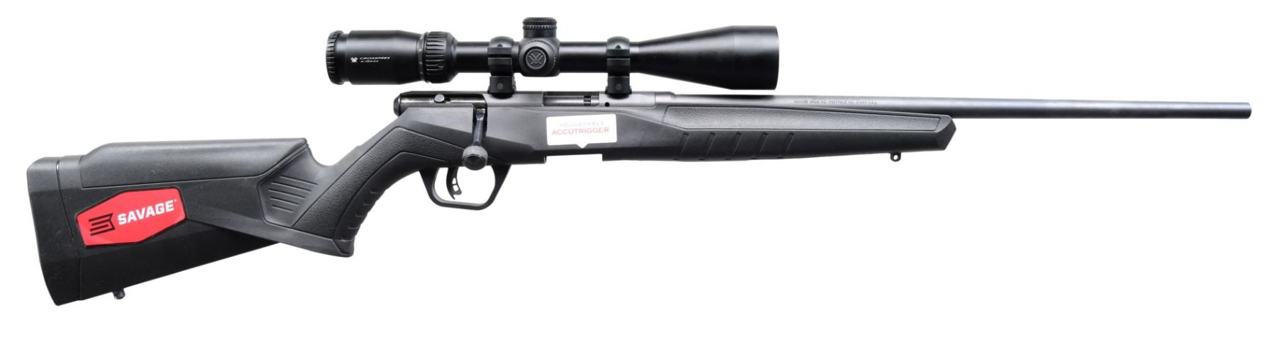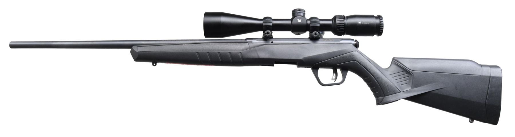 Cal. 22 WMR. S# 2821360. Bbl. 21". Model B22 Magnum bolt action rifle mfg. in Canada by Savage Arms and imported by Savage Arms Inc. Left side of the bbl. exhibits markings stipulating the model and cal. designations, above Savage's mfg. and importer information. Metal components exhibit a matte blue finish overall, save for the bolt, which exhibits a standard blue finish. Textured black synthetic pistol grip buttstock. Front and rear iron sights are absent. Receiver is mounted with a Vortex Crossfire II 4-12x44 scope. Mag. is absent. CONDITION: excellent, with metal components retaining bountiful amounts of their original factory finishes overall. Mirror bore, exhibiting strong rifling throughout. Stock is very good overall, with some oxidation present on the sling provisions. Scope retains a clear and sharp optic. (24-4376/MLW). MODERN. $350-500.