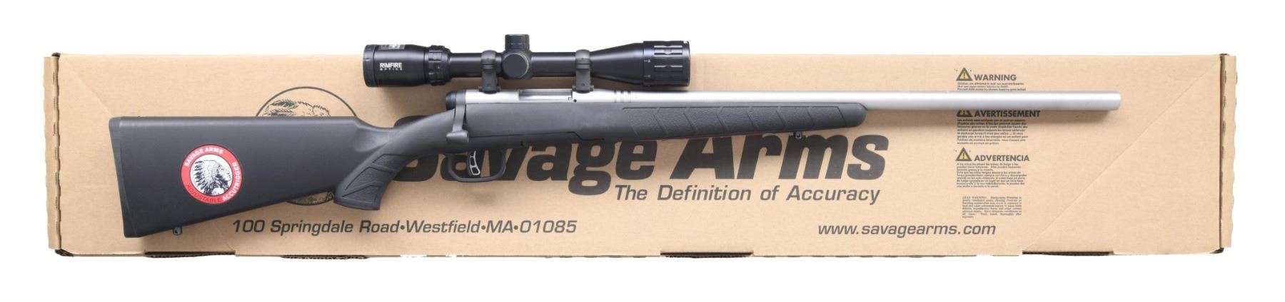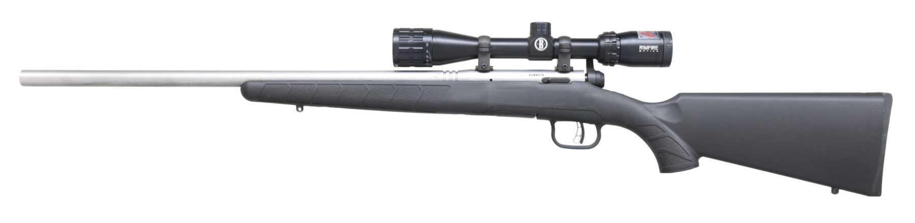 Cal. 17 Win Super Mag. S# K099214. Bbl. 22". Rfile is equipped with a Bushnell Rimfire Optics 3-9x power scope. Scope has a duplex crosshair reticle, very good optics, and a lens cover. Stainless finish. Black synthetic stock with bottom-mounted sling studs. MAGS: one 8-rd., detachable. UNATTACHED ACCESSORIES: matching-numbered factory box with manual and paperwork. CONDITION: all aspects are near excellent, with factory stickers present on stock. (24-3197/MJC). MODERN. $300-400.
