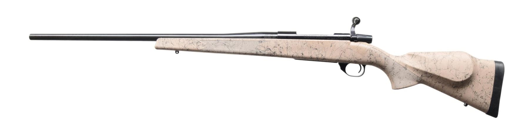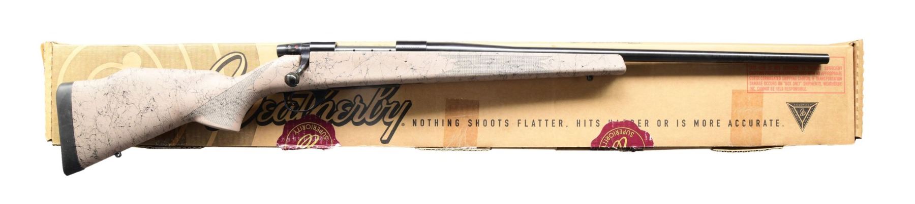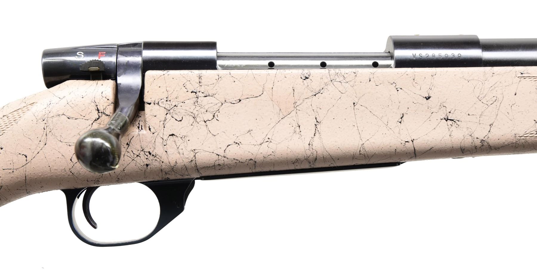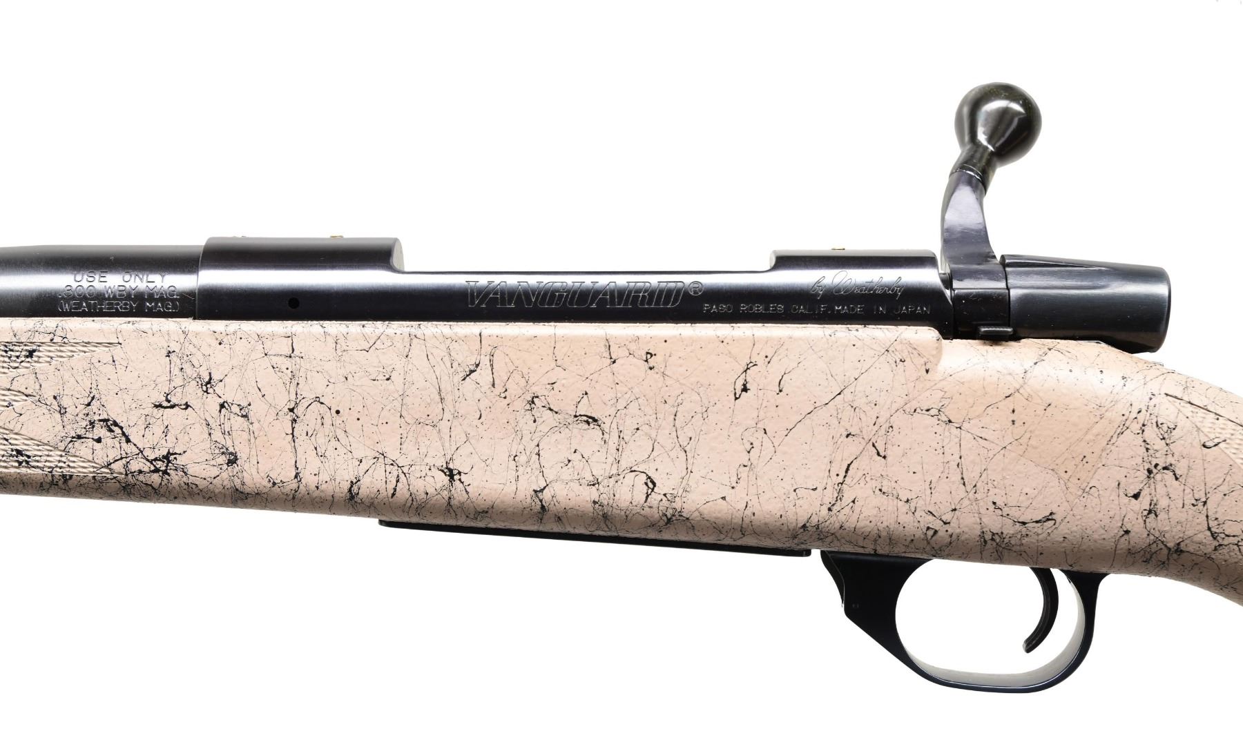 Cal. 300 Wby. Mag. S# VS285939. Bbl. 24". Rifle is devoid of sights, but receiver is factory drilled and tapped for scope mounting. Japanese-made Weatherby Vanguard rifle. Blued finish. Tan and black synthetic stock with left-side cheekpiece, bottom-mounted sling studs, and factory recoil pad. LOP: 13 1/4". UNATTACHED ACCESSORIES: matching-numbered factory box with manual, test target, and cable lock. CONDITION: all aspects are near new; in the box. (24-3497/MJC). MODERN. $500-800.