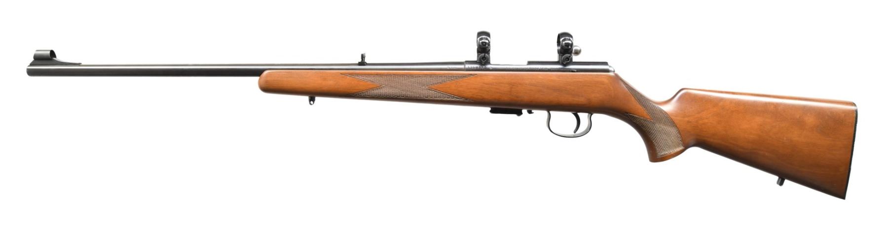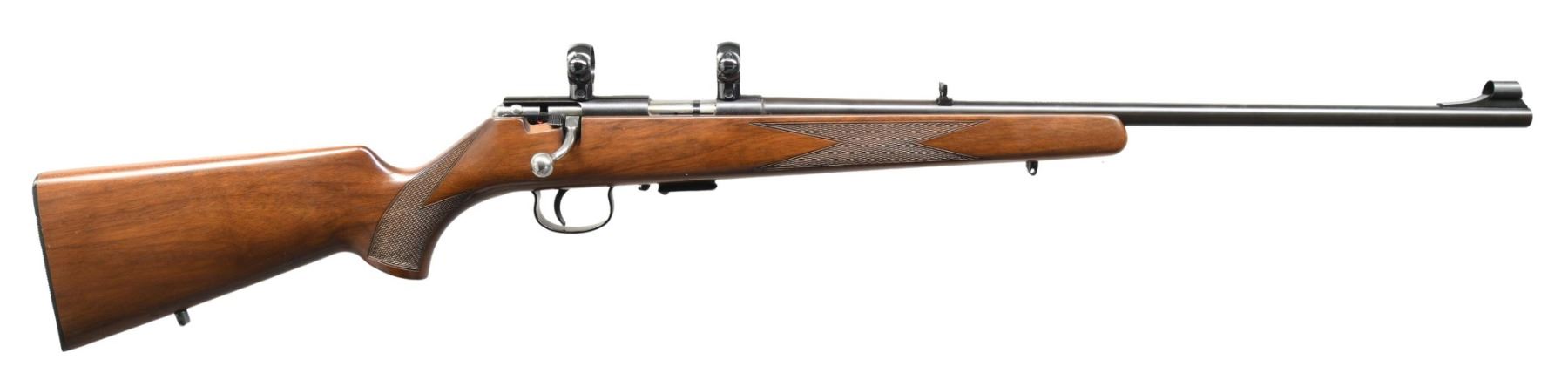 Cal. 22 Mag. S# 1259312 (ID = 1983). Bbl. 22.5". Hooded bead front sight and folding rear sight. Tip off rings on grooved receiver. Checkered walnut sporter stock. MAGS: one 5 rd. CONDITION: near excellent overall, showing light marks. Bright bore. (24-5307/MD). MODERN. $500-750.