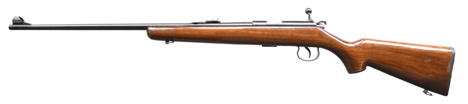 Cal. 22 LR. S# 8922746. Bbl.24". Hooded blade front sight. Sporting-style rear sight. Receiver grooved for scope mounting. Matching-numbered bolt. Blued finish. Hardwood stock set with bottom-mounted sling swivels. MAGS: one 5rd. UNATTACHED ACCESSORIES: matching numbered factory box with manual. CONDITION: stock has thick varnish with a few handling marks. Metal retains 98% original blue with a couple light handling marks. Action functions properly when hand-cycled. Very good+, bright bore. (24-5053/MJC). MODERN. $300-400.