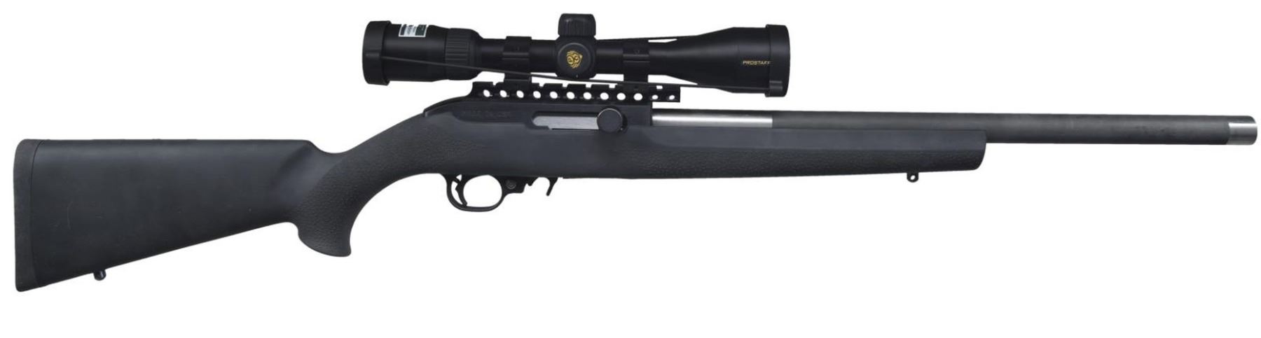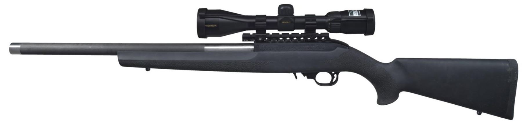 RIFLE. Cal. 22 WMR. S# ML10218. Bbl. 19". Model MLR-1722M semi-automatic rifle mfg. by Magnum Research. The left side of the receiver is marked with the S# and model designation above Magnum Research's mfg. information. Left side of bbl. is marked with the cal. designation at the breech. Aluminum receiver exhibits a black anodized finish, with the bbl. exhibiting a stainless steel finish. Hogue OverMolded textured black rubber pistol grip stock. Bbl. features a graphite sleeve. Receiver is mounted with a Nikon ProStaff 3-9x40mm scope. MAGS: 1-10rd. UNATTACHED ACCESSORIES: factory paperwork. CONDITION: excellent, with metal components retaining bountiful amounts of their original factory finishes overall. Mirror bore, exhibiting well defined rifling throughout. Stock is excellent overall. Scope retains a clear and sharp optic. (23-7382/MLW). MODERN. $500-800.