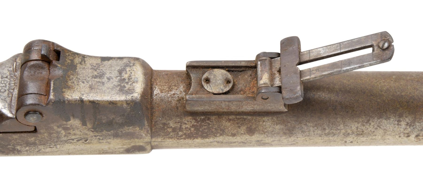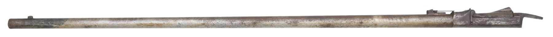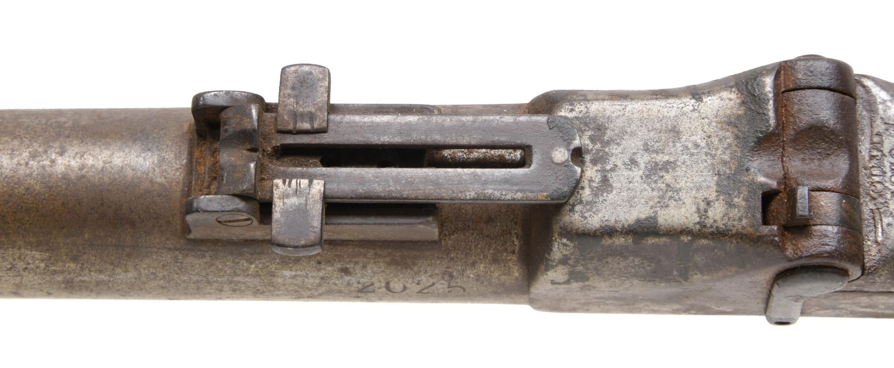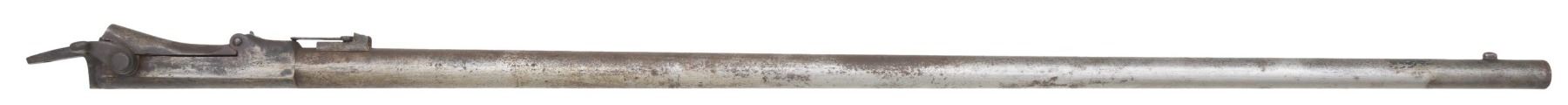 BREECH BLOCK. Cal. 50-70. S# 2725. Bbl. 32 1/2". Ladder rear sight & stud type front sight. Breech block w/ 1870 date has "eagle" & "US" marks. Breech block is complete and functional. Extractor assembly is present. Breech plug is present. CONDITION: the metal is well worn and is turned overall gray and patina w/ light oxidation & fine pitting throughout. Bore has oxidation & extensive pitting w/ visible rifling. (01-25760/RW). ANTIQUE. $25-50.
