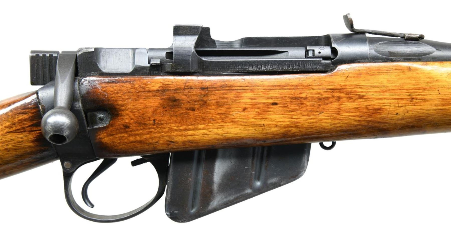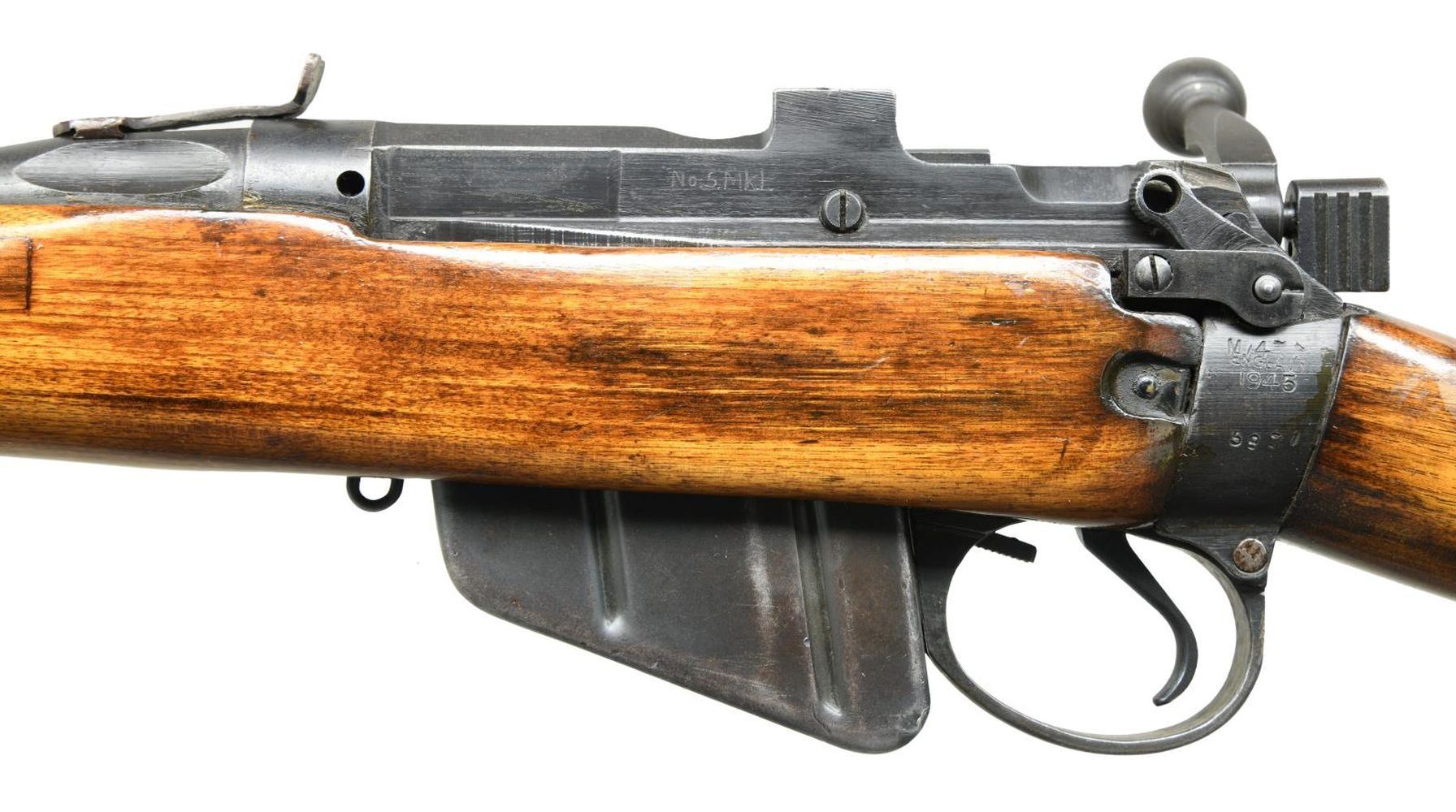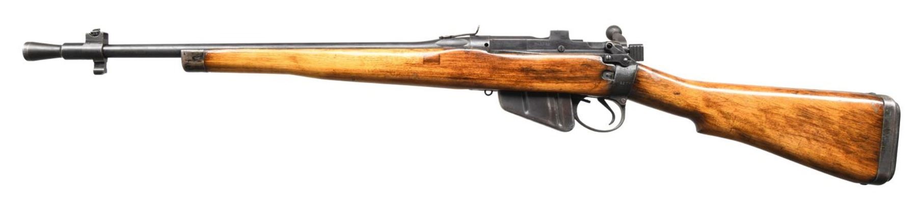 JUNGLE CARBINE. Cal. 303 Brit. S# 5931. Bbl. 20 1/2". No. 5 Mk I bolt action jungle carbine manufactured by Birmingham Small Arms in 1945. The left side of the receiver wall is electro-penciled "No. 5.Mk I.", w/ BSA's manufacturer code "M/47C" above "ENGLAND/ 1945" & the serial number. Handguard has been removed, w/ a crude dovetail cut into the breech that is fitted w/ a crude square notch rear sight. Front sight "ears" & rear sight ladder assembly have been removed. Wood buttstock & forend have been revarnished. CONDITION: metal components retain the majority of their arsenal reapplied blue finish, exhibiting some spots of mild wear & thinning, w/ a few areas of mild surface oxidation. Bright bore, exhibiting well defined rifling throughout. Wood furniture exhibits scattered marks & minor impressions from storage & handling, but otherwise remains sturdy & serviceable. Left side of stock bears an arsenal repair. (23-2572/MLW). CURIO. $300-500.