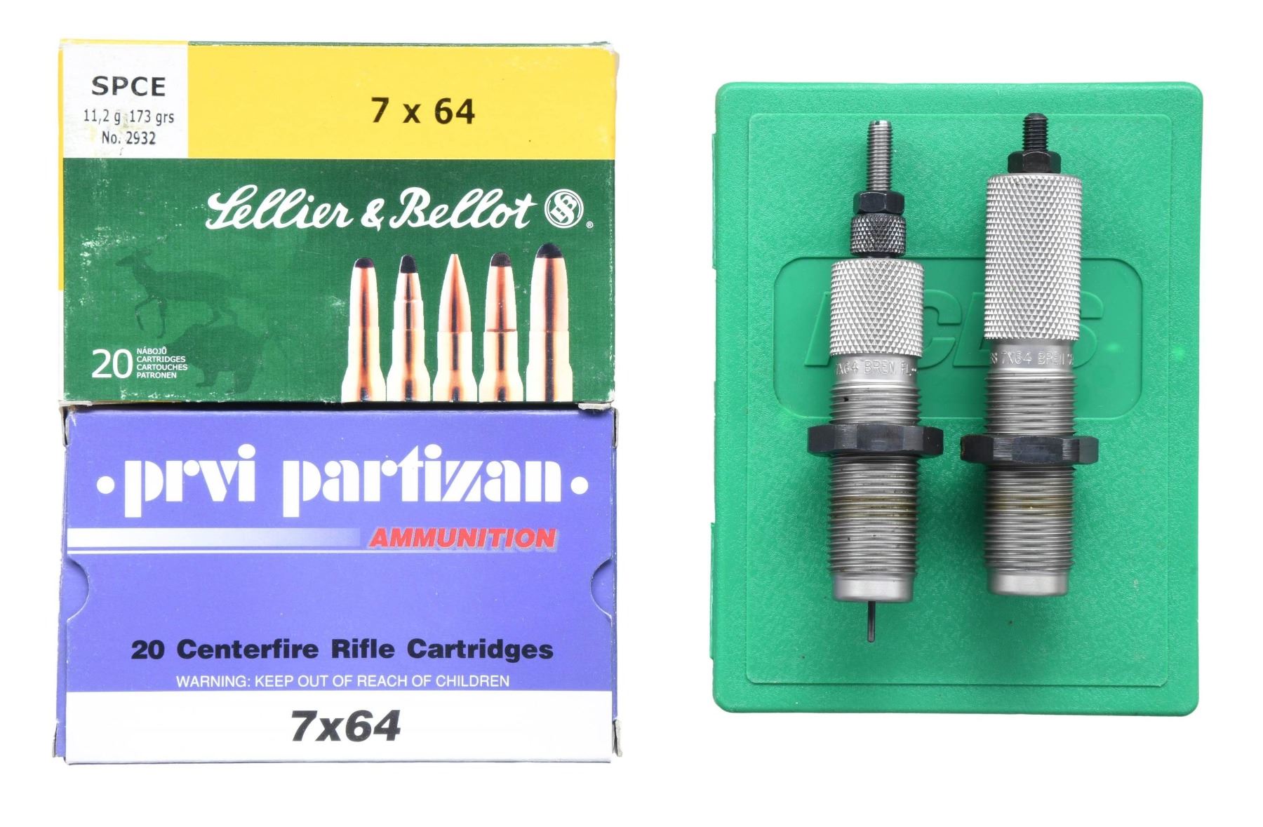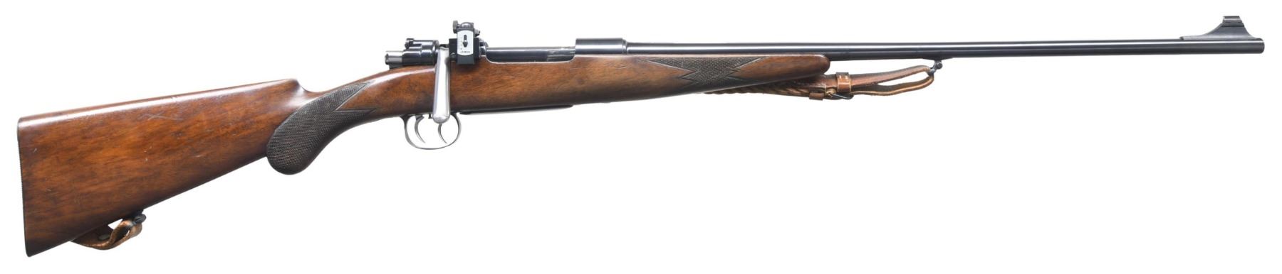 Cal. 7x64mm. NSN. Bbl. 24". Originally mfg. as a Gewehr 98, this example was subsequently reworked into a sporting rifle after the conclusion of World War I. The majority of the original arsenal markings and proofs have been scrubbed, with the left side of the receiver exhibiting commercial proofs, followed by the remnants of the model designation on the receiver wall. Metal components exhibit a reapplied blue finish, with the bolt, bolt handle, cocking piece, trigger assembly, and double set triggers being polished in-the-white. Checkered wood rnd. knob buttstock, with cheekpiece and later grooved steel buttplate. Ramped and brass beaded blade front sight, with contemporary Lyman adj. aperture rear sight. Bolt has been modified into a spoon handle configuration. Trigger guard set screws have been welded in place and cut to accomate the receiver screws. UNATTACHED ACCESSORIES: 1 20-rd. box of Sellier & Bellot 173 grain SPCE ammunition, 1 20-rd. box of Prvi Partizan 7x64mm 140 grain PSP BT ammunition, as well as a RCBS 7x64mm FL die set. CONDITION: metal components retain bountiful amounts of their reapplied blue finish, exhibiting few superficial handling marks overall. In-the-white parts exhibit a few areas of pitting, but otherwise remain sturdy and serviceable. Mirror bore, exhibiting well defined rifling throughout. Stock exhibits scattered scattered marks and minor impressions from handling and storage, with a chip present on the underside of the wrist, at the trigger guard tang. (24-4578/MLW). MODERN. $300-400.