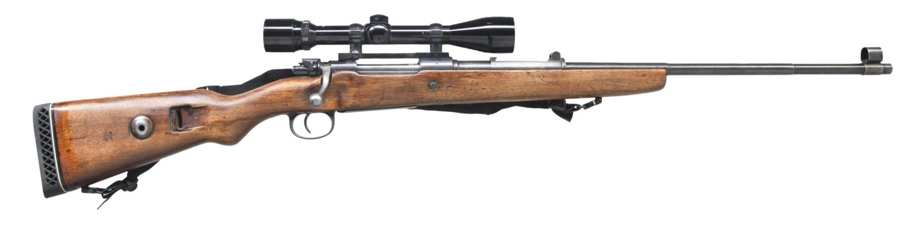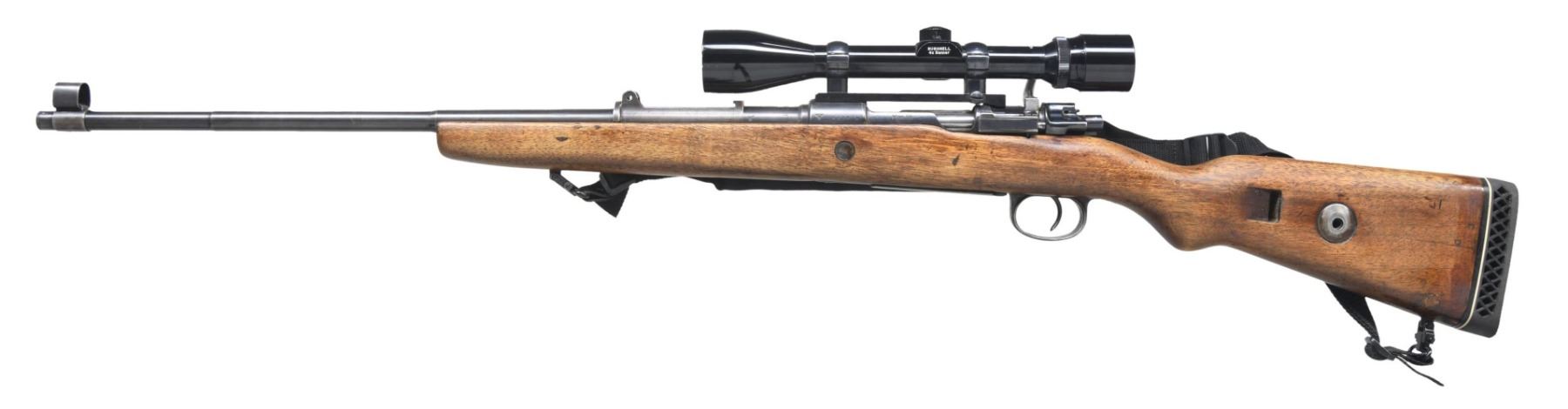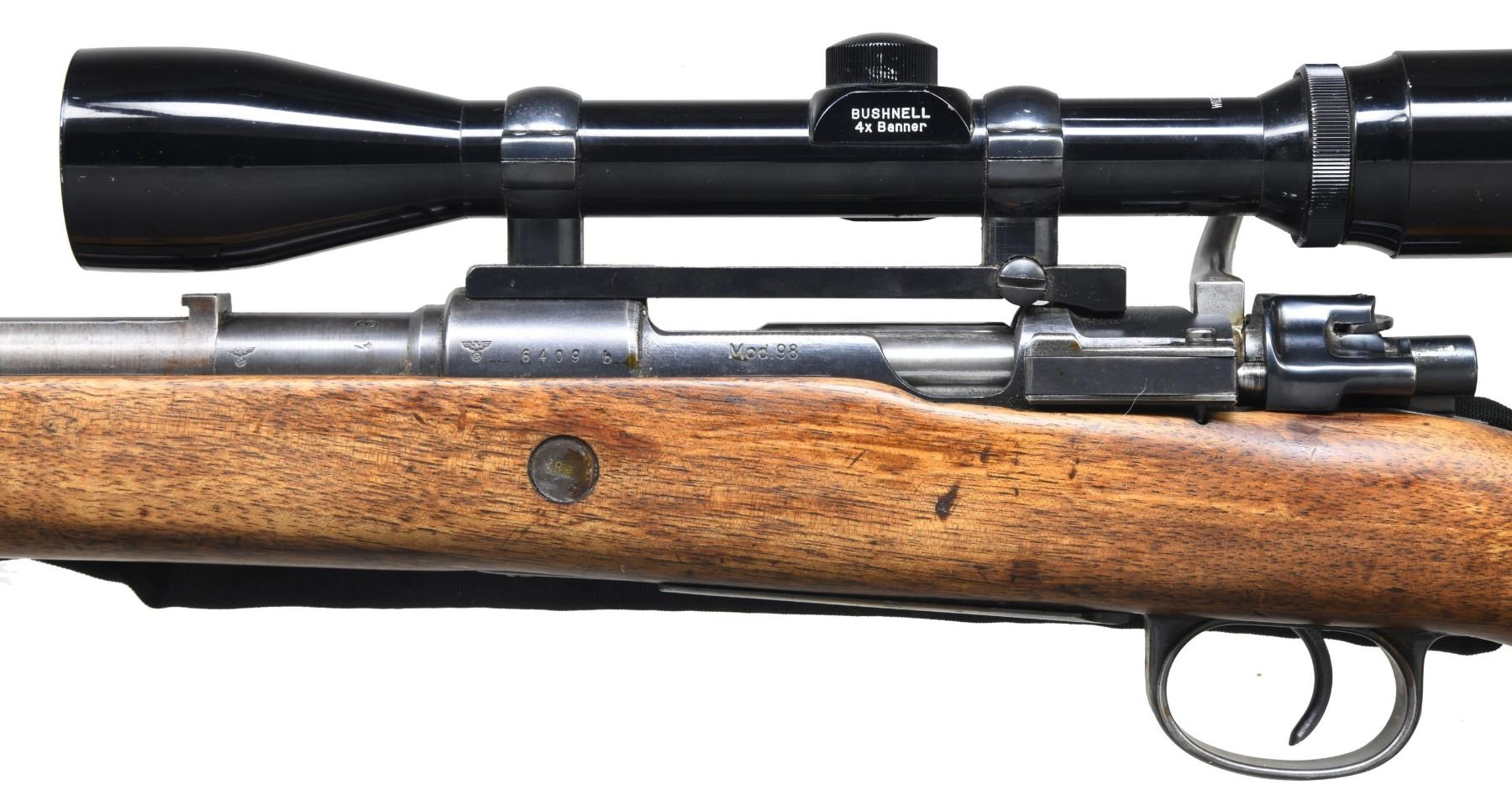 Cal. 8mm Mauser. S# 6409b. Bbl. 23 1/2". Blade front sight with hood. Original tangent rear sight not present. Rifle is equipped with a receiver-mounted Bushnell Banner 4x power scope. Scope has a duplex crosshair reticle and very good optics. Matching numbers on receiver, trigger guard, and floorplate. Bolt has turned down handle, swept safety, and appears to be of Belgian mfg. Receiver has eagle "135" marking, denoting it is of Mauser Oberndorf mfg. Blued finish. Locking screws are missing. Cutdown hardwood stock with bottom-mounted sling swivels, aftermarket black sling, and Pachmayr White Line recoil pad. LOP: 13 1/2". CONDITION: refinished cutdown stock has an added screw-in bolt cutout, added oil finish, a couple cracks behind the upper tang, scattered dings, and handling wear. Metal retains 50% blue with some dings, scattered fading to gray, and oxidation. Action functions properly when hand-cycled. Bore is bright with strong rifling but shows scattered frosting and oxidation. (24-5451/MJC). MODERN. $100-200.