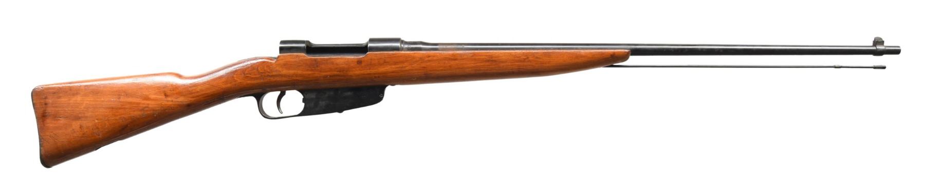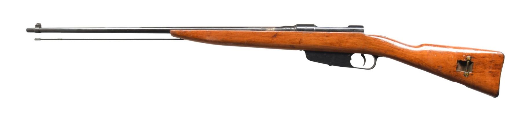 RIFLE. Cal. 6.5 Carcano. S# AV7473. Bbl. 27". Inverted "V" front sight. Bbl. marked w/ boxed "crown" & "Made Italy". Rifle has been sporterized by the removal of rear sight, bbl. bands. Stock has been shortened to sporter configuration. Bolt assembly is not present. Cleaning rod is present. CONDITION: stock set has been sanded w/ added gloss finish. Crack behind receiver tang. Blued metal has light wear & thinning. Dark oxidized bore shows traces of rifling. (24-5088/RW). CURIO. $50-100.