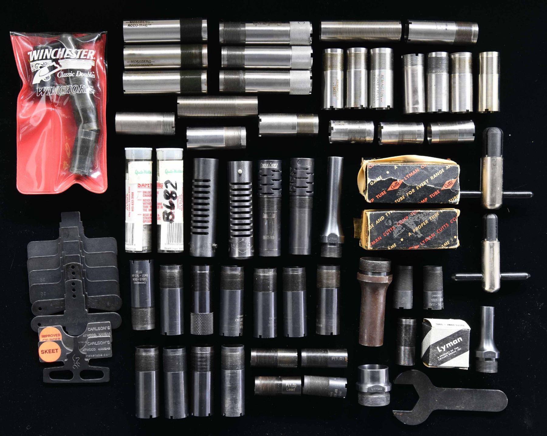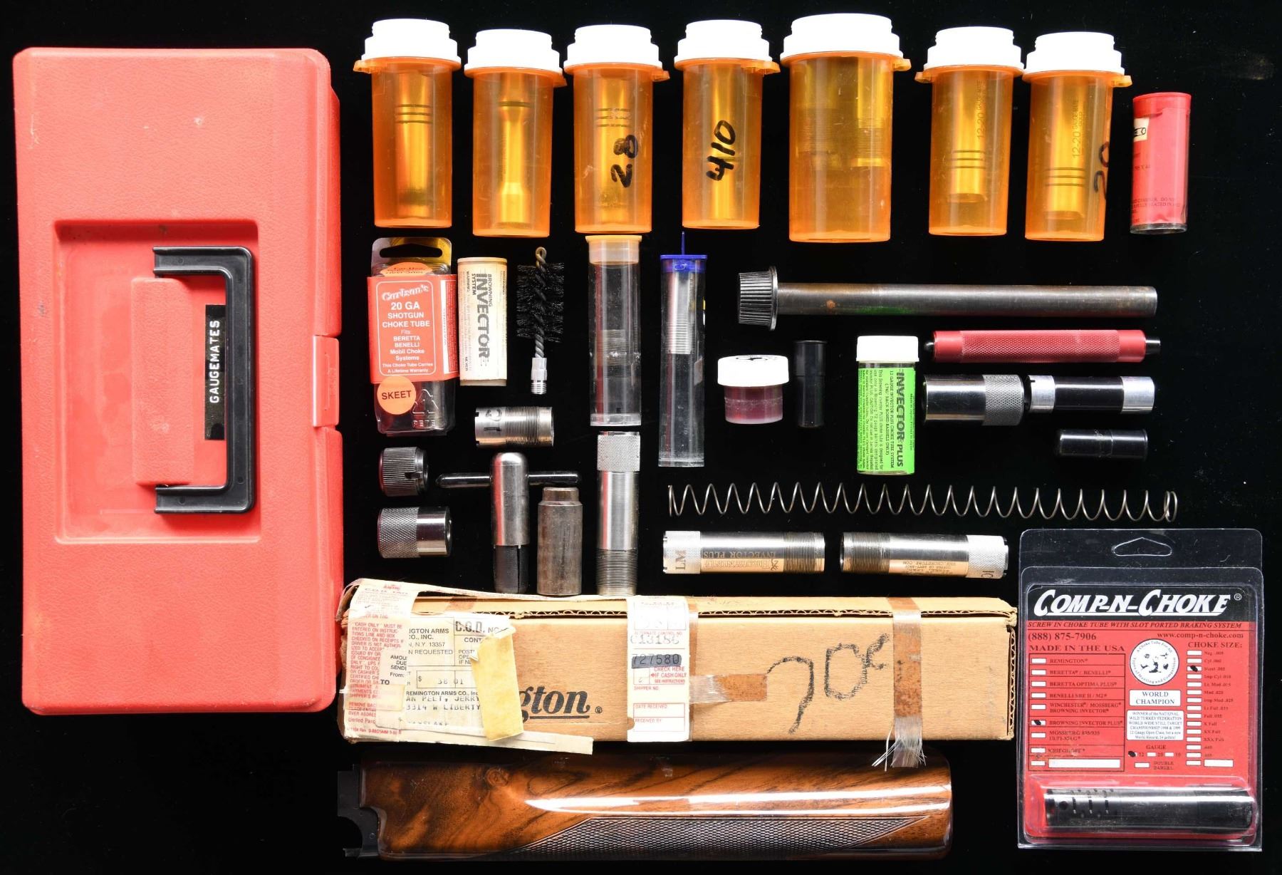 Lot consists of an assortment of shotgun chokes, produced by a variety of mfgs. for a variety of models. Lot is also accompanied by a checkered wood forend forend and several shotgun parts. CONDITION: very good overall. Forend and parts show some scattered marks from handling and storage, but otherwise remain sturdy and serviceable. (02-23057/MLW). $50-75.