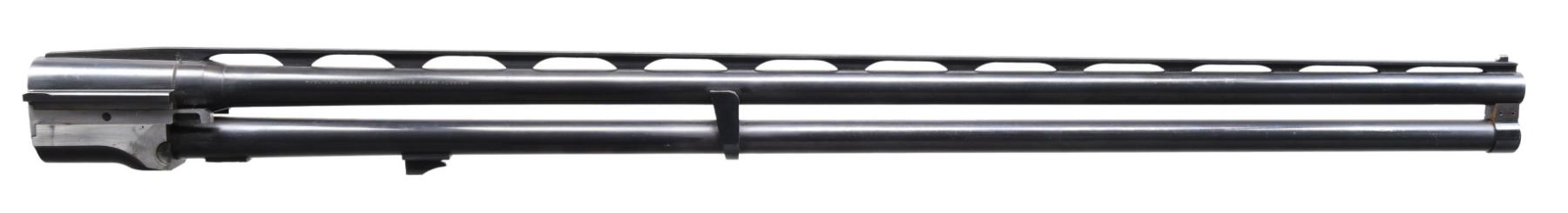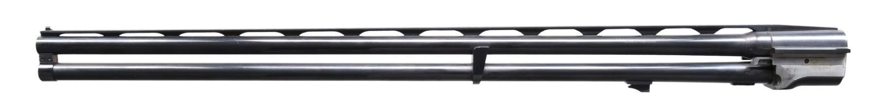 BARREL SET. Cal. 28 Ga. Mag. S# 4649-2. Bbls. 28" with raised vent rib having white front bead and missing mid bead. Fitted with thin wall choke tubes that each approximate Cyl. choke. Besides normal proofs, each barrel marked "28/76" and 'MAGNUM". Bottom of breech block has serial number "4649-2" plus "669" that likely represents June of 1969. Exterior is close to excellent with an occasional light mark. Bores are near excellent. When will you ever see an offering like this again? (02-23111-3). $1,000-2,000.