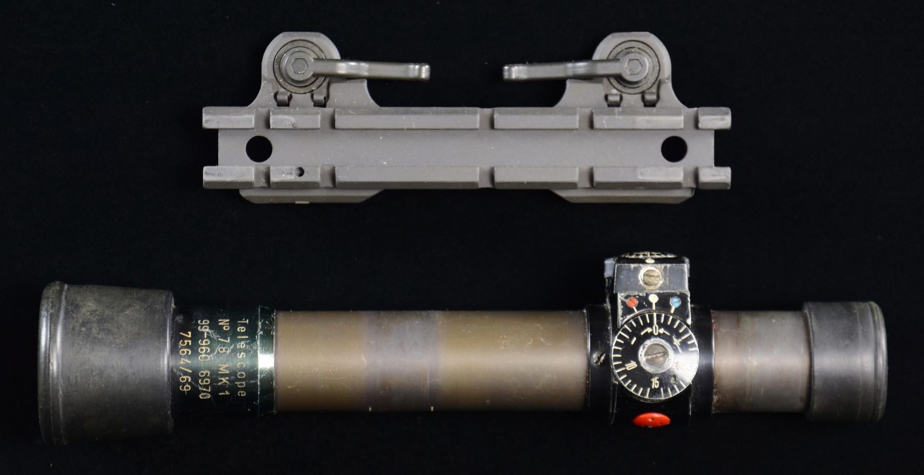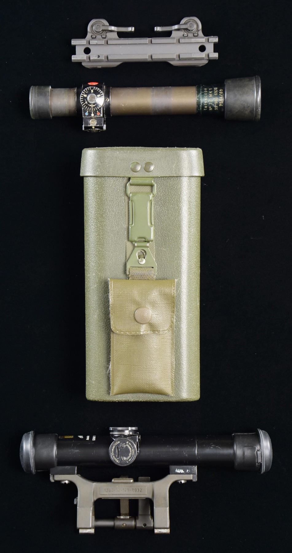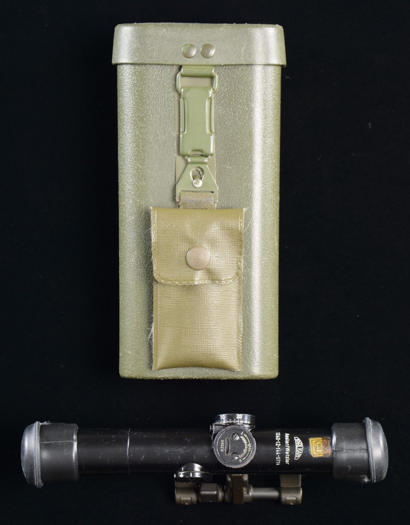 EXTRAS. 1). KARL KAPS ZF 4X scope with HK STANAG claw mount marked "SchuBrichtung". Most scopes of this type made by Hensoldt; uncommon by Kaps of Kassel. Elevation dial is meter marked for BDC. Inventory numbers beginning with "1240-12" on scope and mount. Standard rubber flip open caps on its 30mm tube. Reticle has blunt ended horizontal posts with windage hash marks; pointed center vertical post. Decal near brand name with eagle symbol and "BWB 1294". UNATTACHED ACCESSORIES: very good to excellent green hard shell carry case with maintenance packet inside plus darkened sun lens secured under lid. Extra rubber lens cap and copied instructions on how to adjust and zero. CONDITION: very light marks on scope tube plus small mark touched up with black paint; generally very good to excellent with near excellent optics. 2). DR. WOHLER No. 78 MK 1 scope for Carl Gustav 84mm M48 recoilless rifle (rocket launcher) that was used by England from 1961-1991; scope made 1969. Steel 26mm tube with rubber end pieces. Reticle is thin vertical post plus horizontal lines having windage marks near center. CONDITION: numerous light marks throughout plus thinning of finishes. Near excellent optics. 3). A.R.M.S. double lever STANAG mount for Picatinny base; mount also has Weaver style cross slots. Can be used with #1 listed scope or for other types of optics. CONDITION: all aspects near excellent. (02-23163/NW). $650-900.
