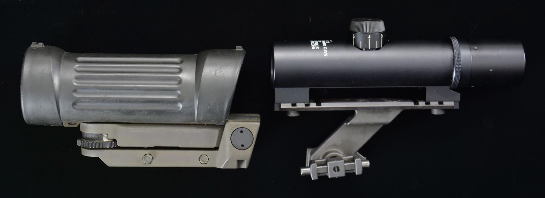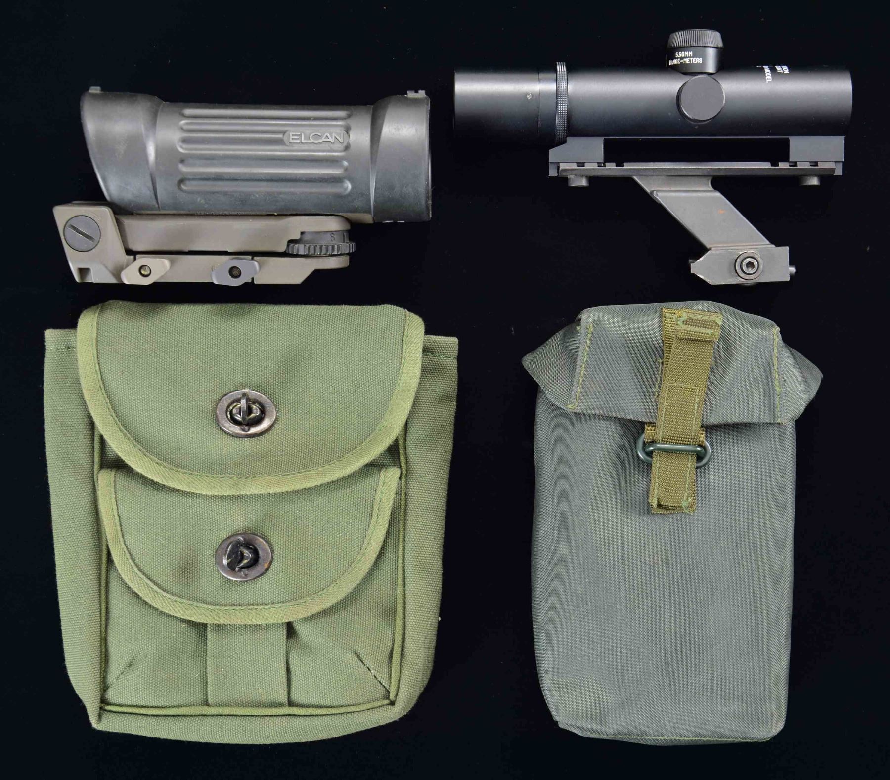 1) C.M.O. 4x21 Special Edition NATO Standard Model scope. Top of housing is marked "SPECIAL EDITION/ STANAG MOUNT/ 4X21/ NATO STANDARD MODEL/ C.M.O./ JAPAN". Side of upper turret is marked "5.56MM/ RANGE-METERS". Aluminum housing and adj. knobs exhibit a black anodized finish. Parkerized steel Galil pattern mount. UNATTACHED ACCESSORIES: green canvas carrier. CONDITION: exterior is excellent, showing minimal light superficial marks from handling and storage. Scope retains a clear and sharp optic. 2) ELCAN C79 3.4x scope. Housing's rubberized exterior is marked "ELCAN", with the S# "SER-94-42779" marked on an exposed section down by the mount. Mount exhibits a parkerized finish. UNATTACHED ACCESSORIES: green canvas web pouch. very good to excellent, with the exterior exhibiting some superficial marks from handling and storage. Optic exhibits a few small black spots and a couple of scuffs, but otherwise retains a clear and sharp picture. (02-23161/MLW). $300-500.
