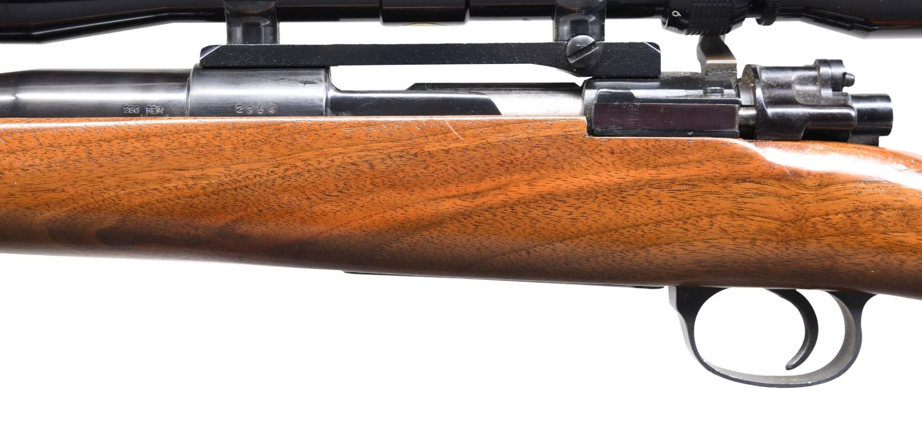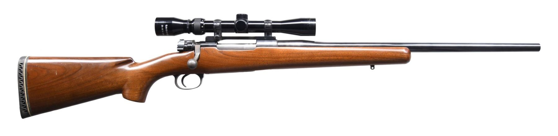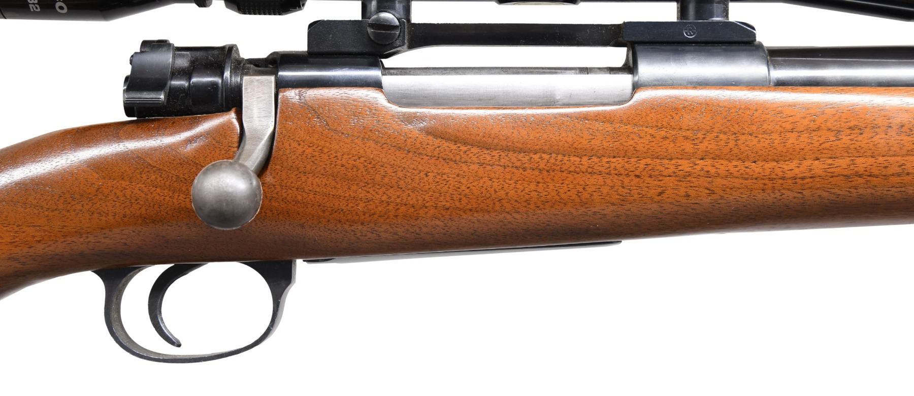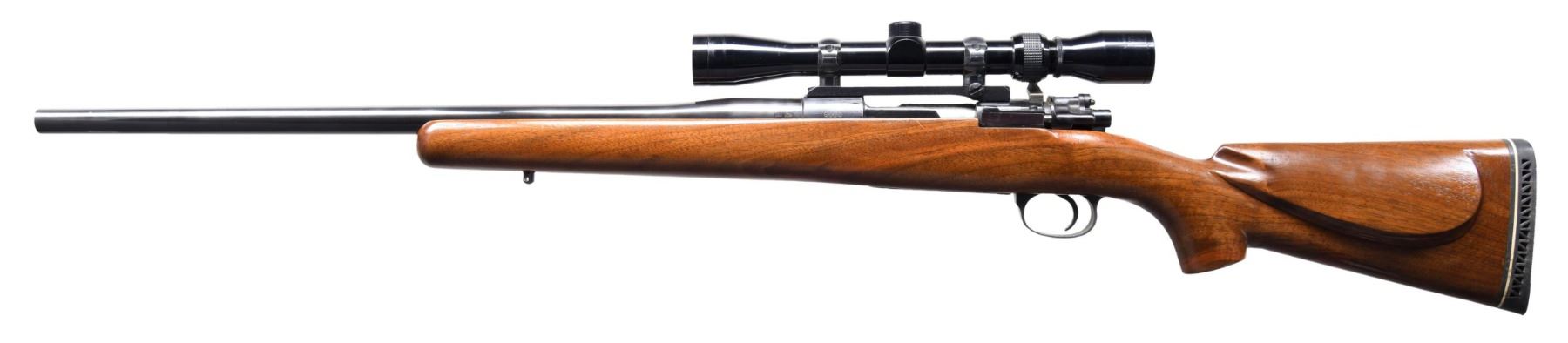 Cal. 280 Rem. S# 2354. Bbl. 22 1/2". Mauser bolt action rifle produced by an unknown mfg. and subsequently converted into a sporting rifle. Left side of the custom heavy bbl. is marked "280 REM", with the S# "2354" marked on the left side of the chamber. Metal components exhibit a reapplied blue finish overall, save for on the bolt, which is in-the-white. Plain wood pistol grip buttstock, with cheekpiece. Receiver is mounted with a Tasco3-9x32mm scope. UNATTACHED ACCESSORIES: leather sling. CONDITION: metal components retain bountiful amounts of their reapplied blue finish overall, exhibiting some light wear and a few small superficial handling marks overall. Bolt retains a mostly gray patina, with scattered spots of light to mild pitting overall. Mirror bore, exhibiting scattered spots of what appears to be hardened grease, while retaining strong rifling throughout. Stock shows a few scattered marks from handling and storage, but otherwise remains sturdy and serviceable. Scope retains a clear and sharp optic. Leather sling remains malleable, exhibiting some areas of light crazing. PROVENANCE: From the Collection of a Tennessee Gentleman. (24-4481/MLW). MODERN. $500-800.