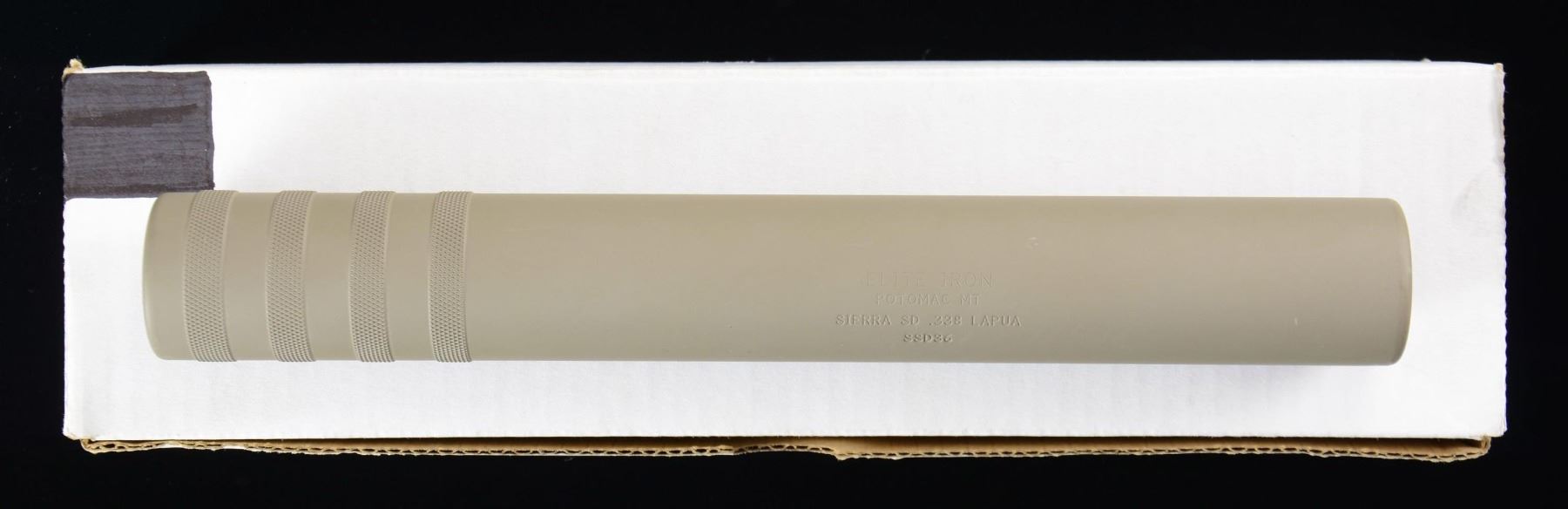 SUPPRESSOR. Cal. 338 Lapua. S# SSD36. The Sierra SD is a 12" long sound suppressor, w/ a 1.56" knurled outside diameter. FDE Cerakote finish. Suitable for use w/ .338 Lapua, .338 RUM, .338 Edge, .338 Norma, and .338–378. UNATTACHED ACCESSORIES: factory box, mounting system & paperwork. CONDITION: As new in box. No sign of being fired, or even attached to a firearm. NATIONAL FIREARMS ACT SILENCER REQUIRING BATF TRANSFER BEFORE TAKING POSSESSION. FULLY TRANSFERABLE. (03-1707/JZ). MODERN CLASS III. $500-800.