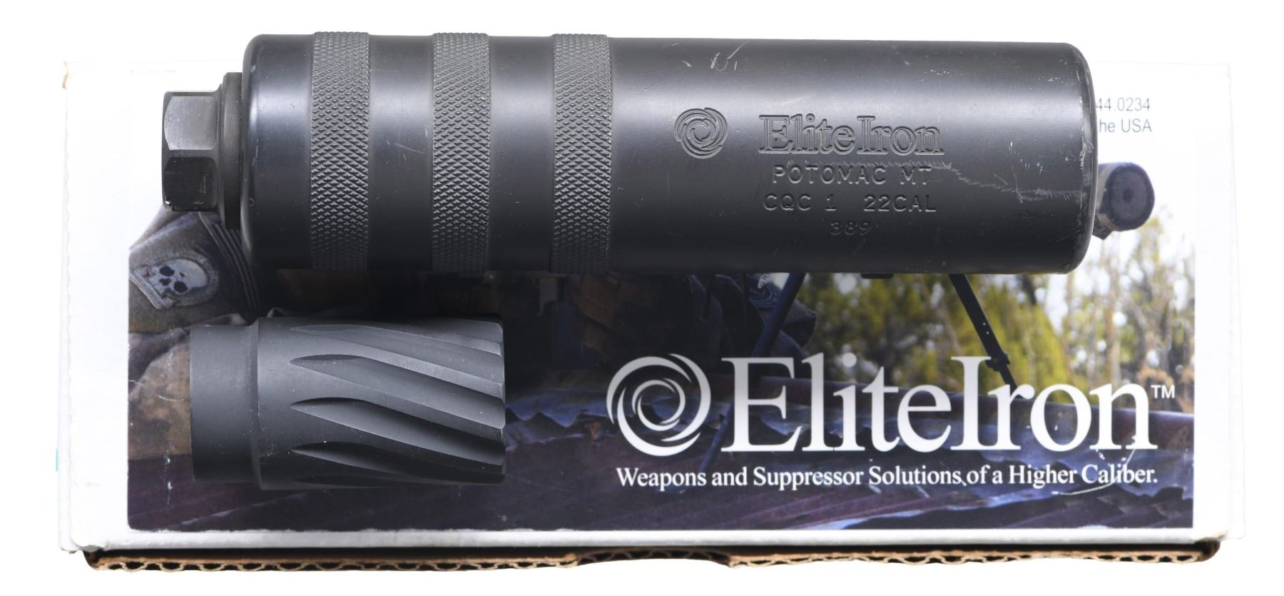 Cal. 22. S# 389. Rugged, compact sound suppressor from Elite Iron. With an overall length of 5.35" and an outside diameter of 1.5" it remains small while providing a factory recorded 34 db reduction. Tube is constructed of 300 series Stainless Steel w/ 17/4PH H900 Stainless Steel internals. Black Cerakote finish. UNATTACHED ACCESSORIES: in factory box w/ flash hider. CONDITION: It appears to have seen light use, possessing some light handling marks. Internals demonstrate some light carbon staining but no sign excessive use. NATIONAL FIREARMS ACT SOUND SUPPRESSOR REQUIRING BATF TRANSFER BEFORE TAKING POSSESSION. FULLY TRANSFERABLE.(03-1747/JZ). MODERN CLASS III. $300-500.