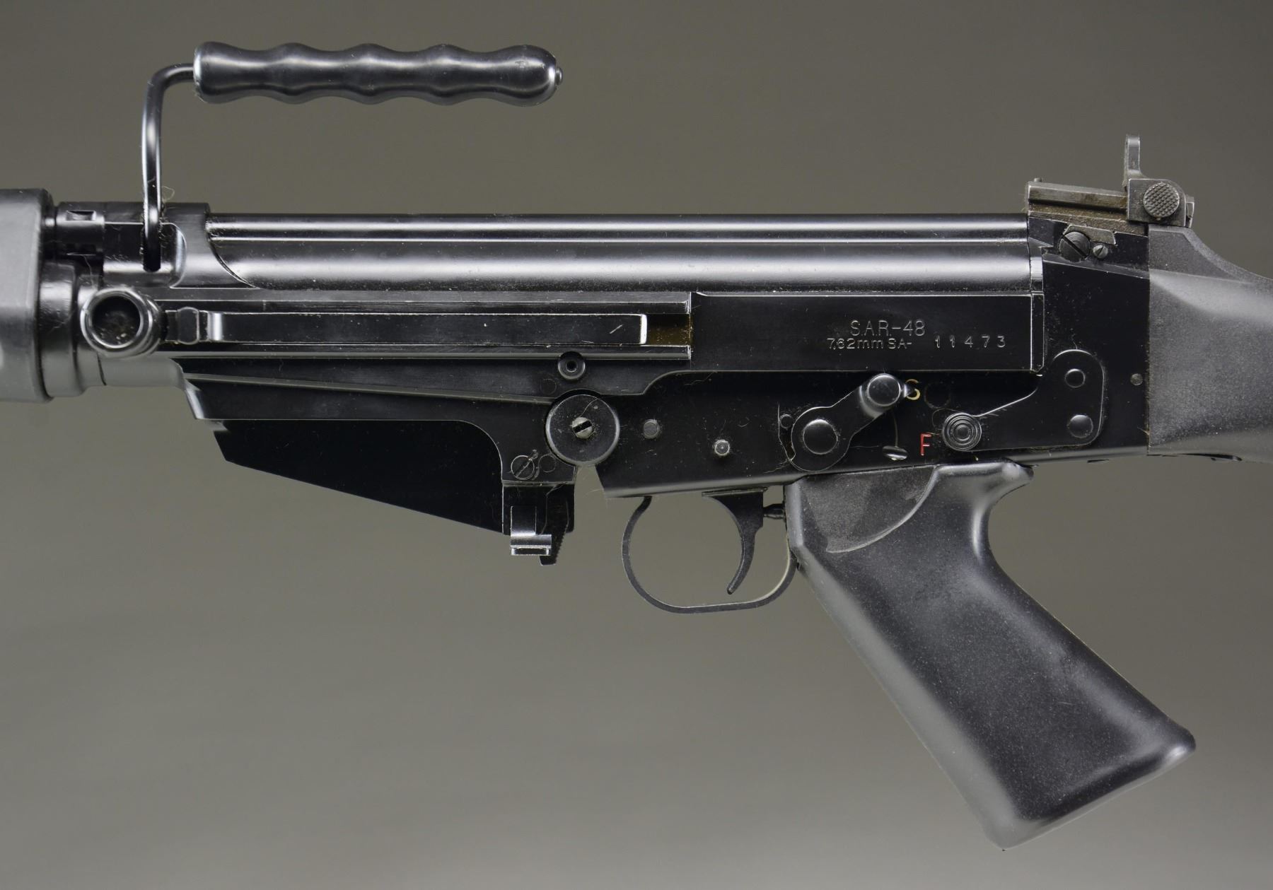 Cal. 7.62x51. S# 1143. Bbl. 16.5" Springfield Armory's contender in the wildly popular FN-FAL market included this example, the SAR-48 MATCH in the standard rifle configuration. Imported between 1985 & 1989, originally manufactured by IMBEL, Brazil, American civilians finally had the opportunity to own a quality metric pattern variant of the battle rifle known as the "Right Arm of the Free World". This semi-automatic Springfield offering was available in several configurations. Front sight is protected post. Rear sight is graduated peep sight adj. 200 to 600 meters. Black plastic forend, buttstock & pistol grip. Top folding carry handle. Folding, collapsible bipod mounted below gas block. Non reciprocating left side charging handle. Left side safety selector. Left side receiver markings include "SAR-48 7.62mm SA-11473". Right side receiver markings include "Springfield Armory Geneseo, IL USA / 1005-SA-48-MATCH" & crossed canon Springfield logo. Receiver bottom marked "IMBEL ITAJUBÁ BRAZIL". Original top cover. CONDITION: All aspects indicate very little use, if any. Action & even the barrel was filled w/ grease. Bore cleaned up for inspection & is bright bore w/ strong rifling. Fire control mechanism appears to function correctly when cycled by hand. (24-4828/JZ). MODERN. $1,200-1,800.