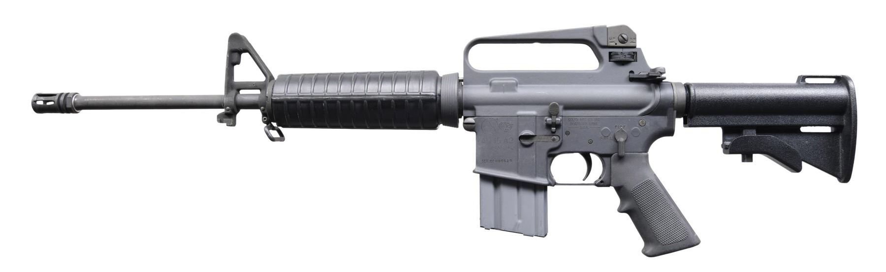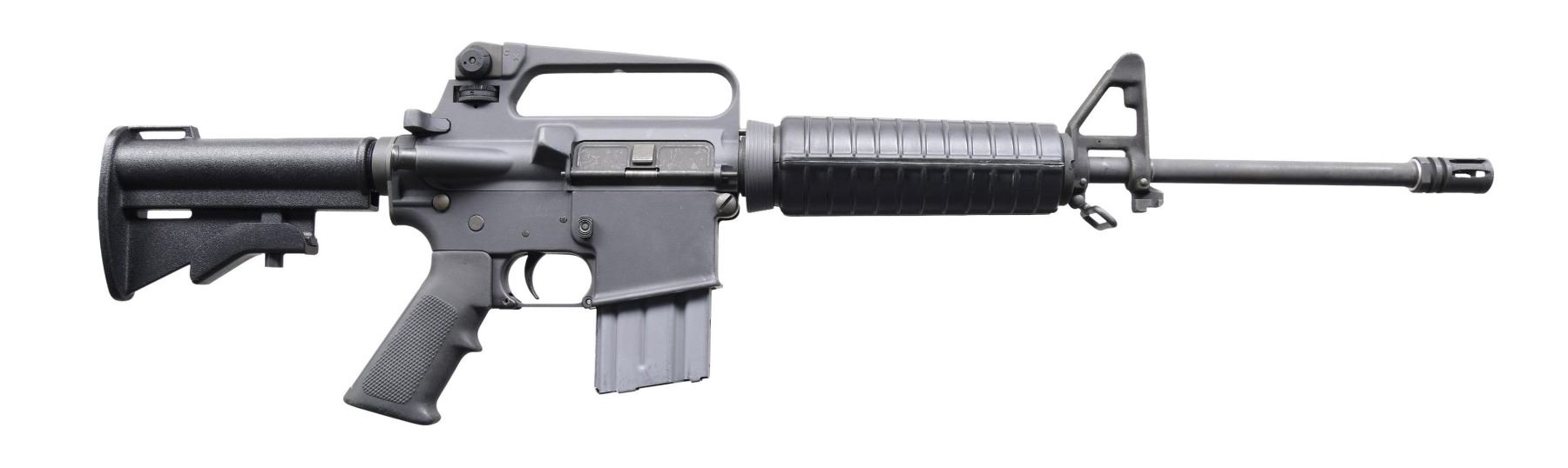 Cal. 223. S# GC006619. Bbl. 16". A beautiful 1980s example of the Model R6520 AR-15A2 Government Carbine, complete in its original green label box. The 16" threaded barrel is terminated with an A2 flash hider. Protected post front sight gas block and bayonet lug, with front sling swivel retaining carbine-length A2 round handguards. Tapered delta ring. Carry handle upper receiver with brass deflector, round forward assist with windage, and elevation-adjustable, duel-aperture rear right. Slab side lower receiver. Threaded front takedown pin. Collapsible, three-position, aluminum shoulder stock. Still retains the unsealed accessory pack. MAGS: two aluminum 20 rd. UNATTACHED ACCESSORIES: green, label-numbered factory box; accessory pack contains two mags., sling, cleaning kit, and owners' manual. CONDITION: all aspects indicate as new; in the box (still in factory plastic bag when received, with unopened accessory pack). No obvious sign of use. Bright bore with strong rifling. Fire control mechanism appears to function correctly when cycled by hand. PROVENANCE: from the lifelong collection of Terrence McCarty. (24-548/JZ). MODERN. $900-1,400.