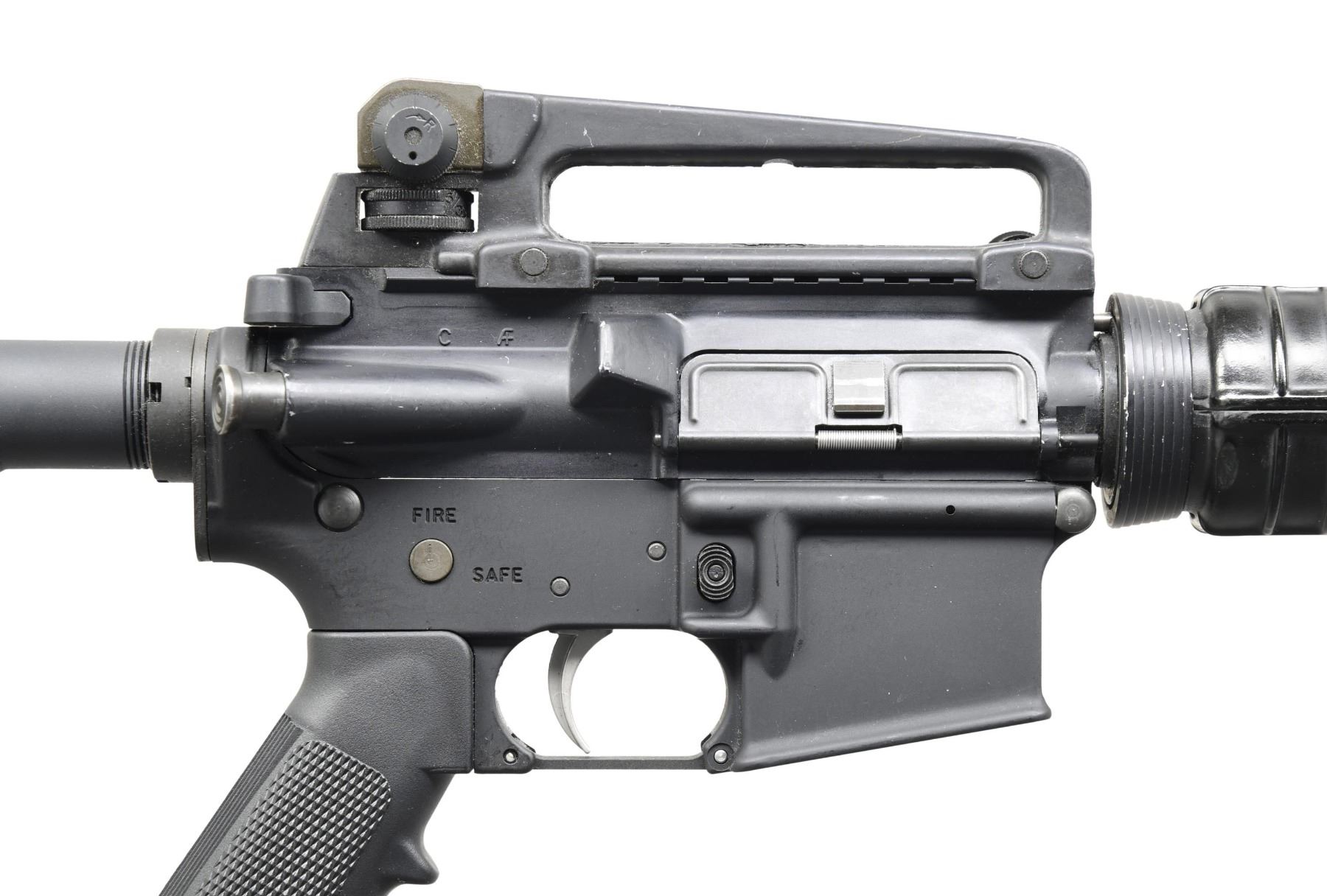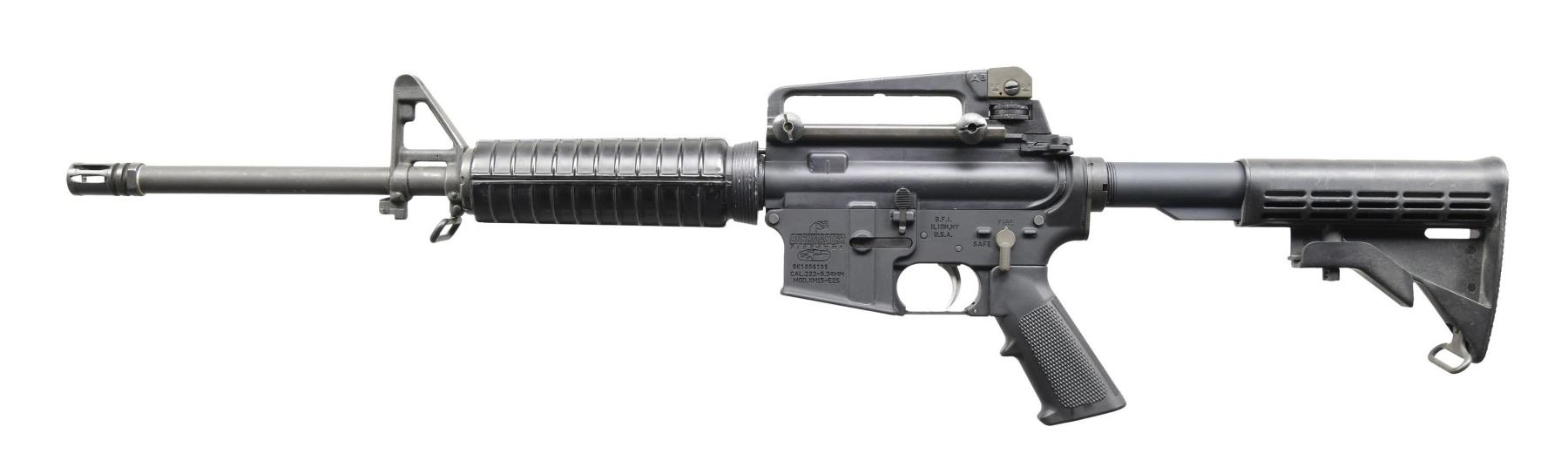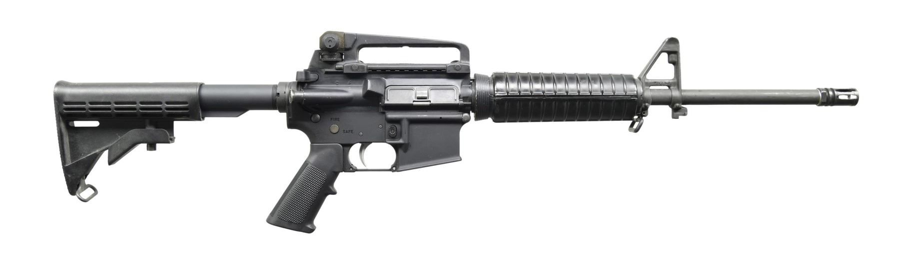 Cal. 5.56 NATO. S# BK1006155. Bbl. 16" HBAR. An Ilion, NY-manufactured Bushmaster XM15-E2S carbine. Heavy, threaded Colt barrel terminated with an A2 flash hider and 1/9 rifling. Protected post front sight, gas block, and bayonet lug. A2 round carbine handguards retained with tapered delta ring. Flat top upper receiver with round forward assist, brass deflector, and removable carry handle with dual-aperture, windage elevation-adjustable protected peep sight. Six-position collapsible shoulder stock. Left side controls. CONDITION: finish is complete and consistent with range-typical thinning and light drag lines. Bore is bright with visible rifling. Fire control mechanism appears to function correctly when cycled by hand. (24-5434/JZ). MODERN. $500-900.