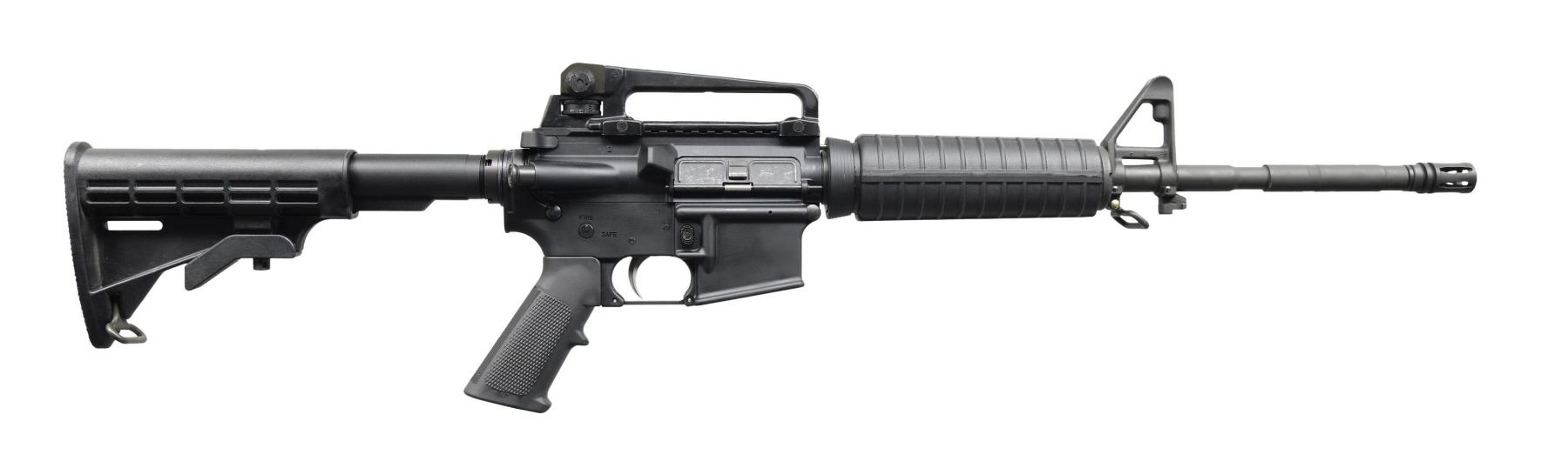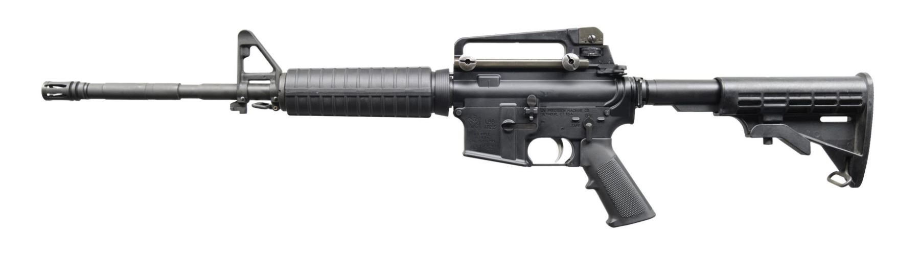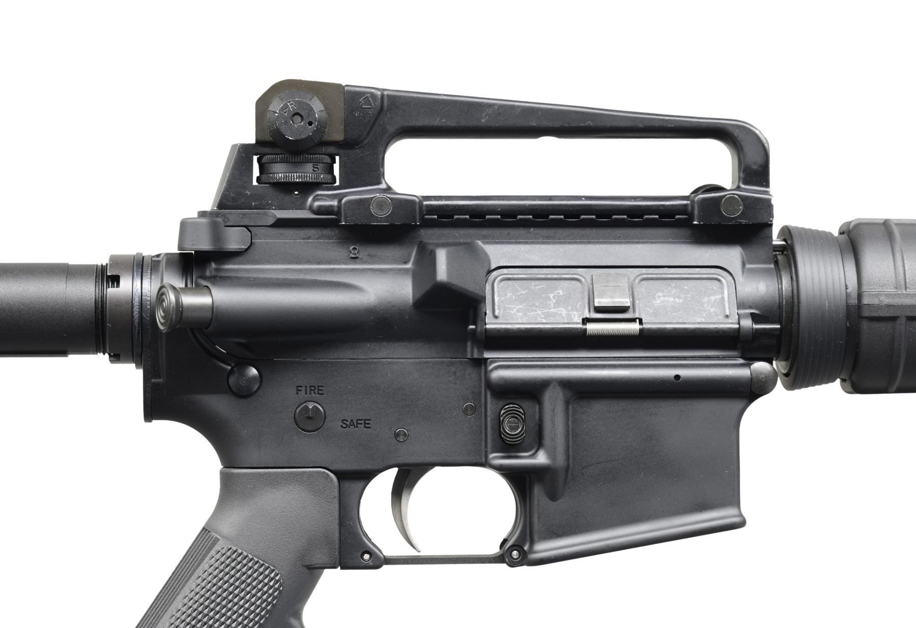 Cal. 5.56 NATO. S# 031663. Bbl. 16". M4 profile 1:9 threaded barrel terminated with an A1-style flash hider. Protected post front sight, gas block, and bayonet lug. Short, round carbine handguards retained with tapered delta ring. Flat top upper receiver with round forward assist and brass deflector. Removable carry handle with windage and elevation-adjustable, dual-aperture rear peep sight. Six-position collapsible shoulder stock. Left side controls. M16 profile bolt carrier. Sling swivels, front and rear. Single-point sling adapter behind castle nut at rear of receiver. CONDITION: All aspects indicate very little use aside from the carry handle, which appears to be from a different firearm. Light thinning on a few high spots. Bright bore with descent rifling. Fire control mechanism appears to function correctly when cycled by hand. (24-5372/JZ). MODERN. $500-900.