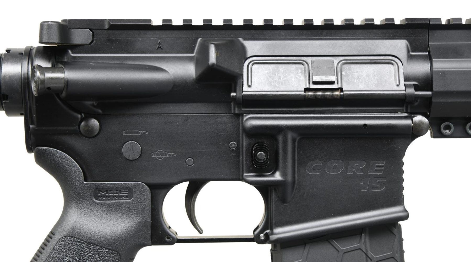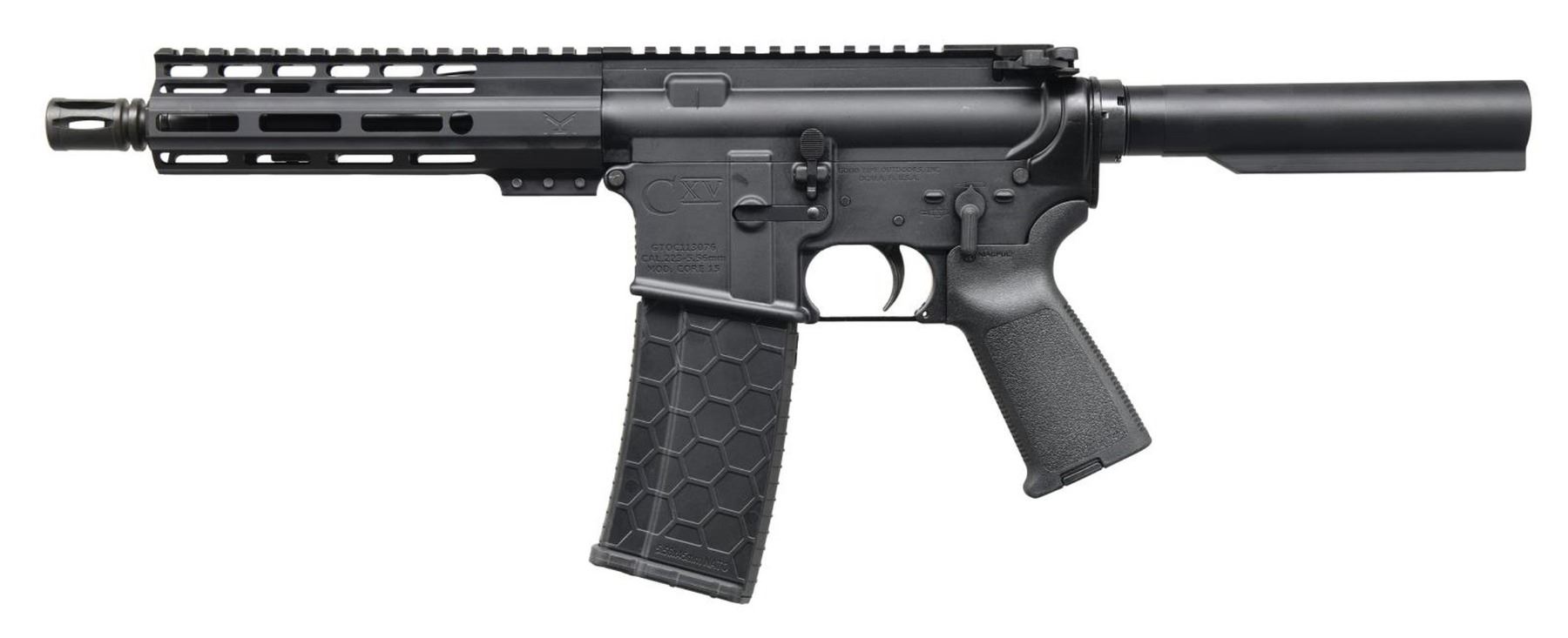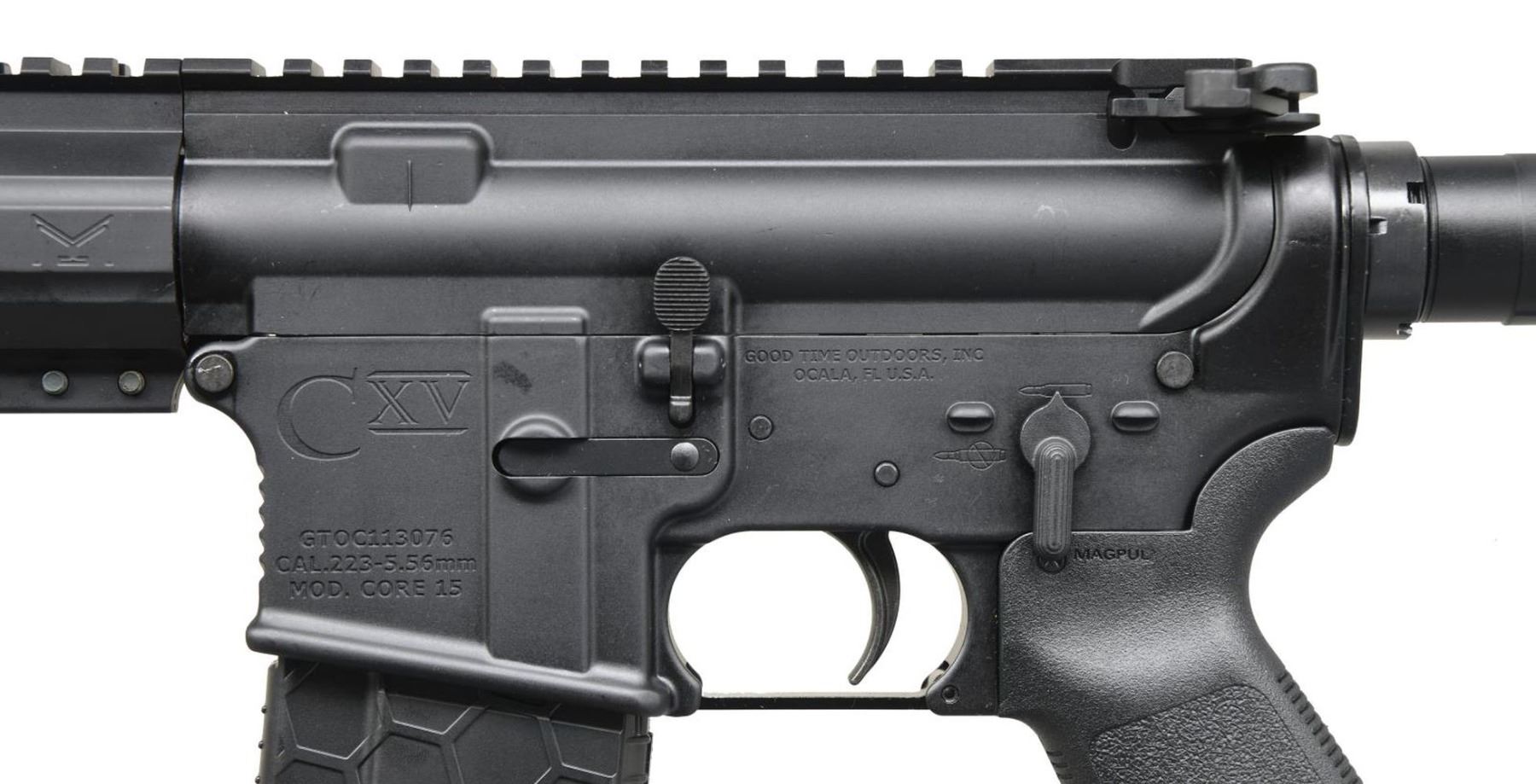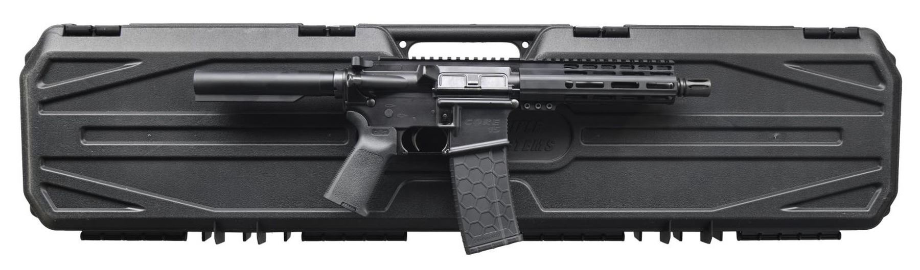 Cal. 5.56mm. S# GTOC113076. Bbl. 7.5". A 7" Free Float M-LOK Handguard with picatinny top rail, providing 12" of sight and optic mounting real estate. Matte black finish. Threaded barrel terminated with A2 flash hider. Nitride Bolt Carrier Group. Pistol-length gas system. Aluminum-forged 7075-T6 Mil-Spec upper and lower receivers. Round forward assist and brass deflector. Left side controls. Magpul MOE pistol grip. Six-position Mil-Spec buffer tube. MAGS: one black 30 rd. HexMag with orange follower. UNATTACHED ACCESSORIES: black plastic, foam-lined transport case, lock, and paperwork. CONDITION: all aspects appear as new. No sign of wear in any capacity. Never sold retail. Bright bore with strong rifling. Fire control mechanism appears to function correctly when cycled by hand. PROVENANCE: from the collection of Gun Sport Ltd., owned by Jon R. Thomas. (23-3775/JZ). MODERN. $500-800.
