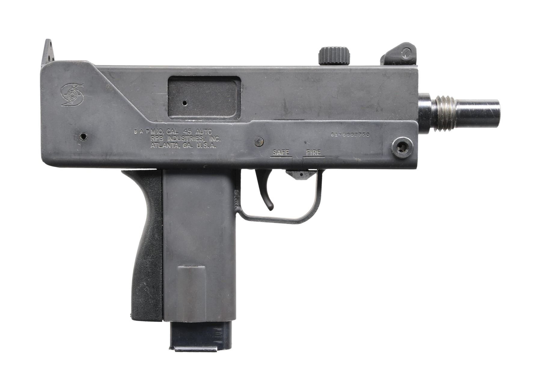 Cal. 45 ACP. S# 81-0002750. Bbl. 5.75". The RPB Industries M10, often mistakenly referred to as the Mac 10 (evidently sounds cooler to the Hollywood crowd), was originally offered in semi-auto as an open bolt system, just like its predecessor, the M10 SMG. The BATF determined that the open bolt semi-autos met the criteria of a machine gun under the "readily restorable" clause and banned future manufacture, grandfathering those that were assembled on or before June 21, 1982, under ATF ruling 82-8. Like everything else, the Federal Government tells citizens they cannot have it; interest in the early originals immediately skyrocketed, and they have been considered highly prized collectibles for over 40 years now. Barrel threaded with traditional Cobray 45 ACP threads. Factory-protected post front and fixed rear peep sights. Rotating cocking knob locks the action closed as an additional safety. Primary safety is located on the front right side of the trigger. MAGS: one steel 10 rd. CONDITION: some of the light exterior finish shows scratches, as common with these pistols from stacking, and is more obvious on the lower receiver than the upper. Bright bore with strong rifling. Fire control mechanism appears to function correctly when cycled by hand. PROVENANCE: from the lifelong collection of Terrence McCarty. (24-247/JZ). MODERN. $500-800.