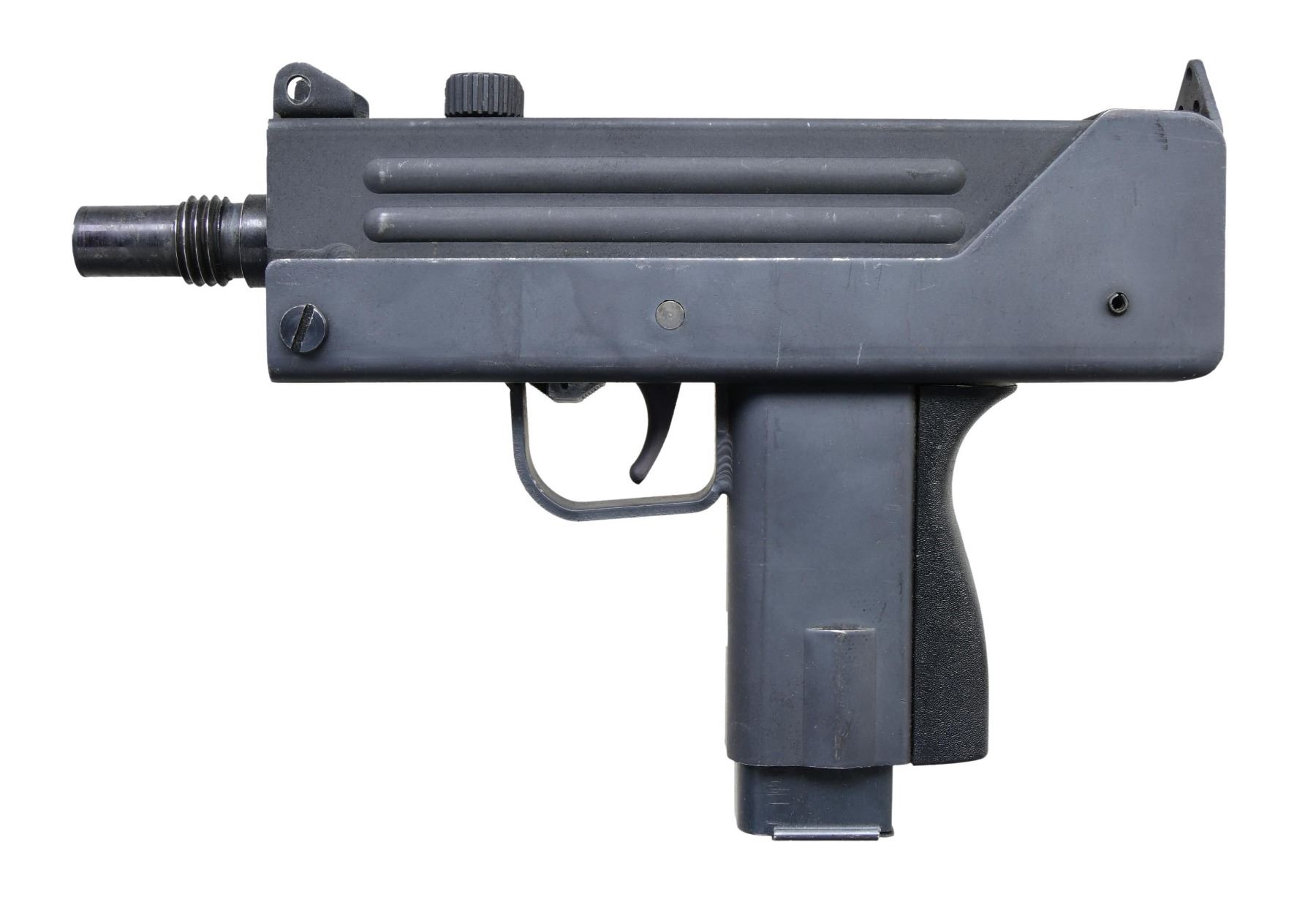 Cal. 45 ACP. S# 81-0003520. Bbl. 5.75". The RPB Industries M10, often mistakenly referred to as the Mac 10 (evidently sounds cooler to the Hollywood crowd), was originally offered in semi-auto as an open bolt system, just like its predecessor, the M10 SMG. The BATF determined that the open bolt semi-autos met the criteria of a machine gun under the "readily restorable" clause and banned future manufacture, grandfathering those that were assembled on or before June 21, 1982, under ATF ruling 82-8. Like everything else, the Federal Government tells citizens they cannot have it; interest in the early originals immediately skyrocketed, and they have been considered highly prized collectibles for over 40 years now. Barrel threaded with traditional Cobray 45 ACP threads. Factory-protected post front and fixed rear peep sights. Rotating cocking knob locks the action closed as an additional safety. Primary safety is located on the front right side of the trigger. MAGS: three steel 30 rd. and one steel 10 rd. UNATTACHED ACCESSORIES: black nylon Cobray bag, mag. loader, two faux suppressors, and one slotted barrel extension. CONDITION: some light exterior finish has scratches, as common with these pistols from stacking. Bright bore with strong rifling. Fire control mechanism appears to function correctly when cycled by hand. PROVENANCE: from the lifelong collection of Terrence McCarty. (24-516/JZ). MODERN. $600-900.