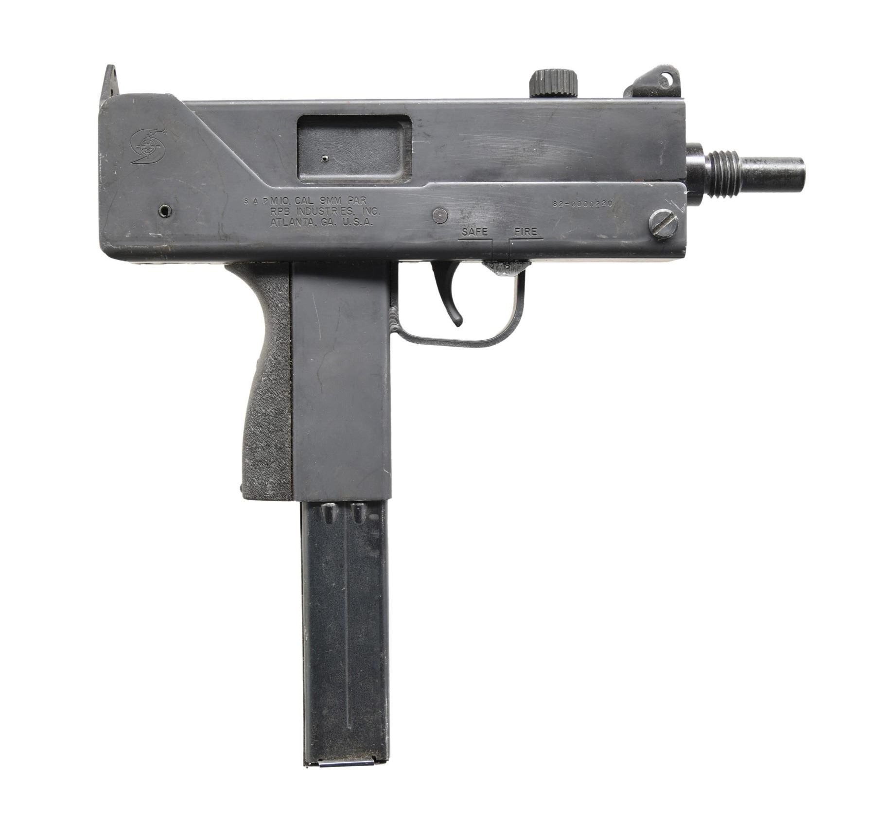 PISTOL. Cal. 9mm Parabellum. S# 82-0000220. Bbl. 6" threaded. Manufactured in 1982. There are very few firearms that conjure up the imagination of the general public more than the mere mention of the MAC 10. The Ingram Model 10 was originally designed in 1964. It would become the 1st of many small simplistic SMGs to contrast the expensive & labor intensive earlier variants such as the Thompson & Reising M50. Ingram’s 2 basic guidelines while designing the Model 10 "simple & cheap" while remaining effective & reliable. Made famous mostly by Hollywood, the M10 had appearances on the silver screen & on television eventually earning the infamous title of "The Gun That Made The 80’s Roar" starting w/ John Wayne utilizing a suppressed 9mm M10 in the 1974 movie "McQ". A favorite example used by the organized anti-gun movement, the Mac 10 was eventually, incorrectly & inaccurately synonymous w/ every crime committed for a long period of time. The semiautomatic M10 was originally offered in semi auto as an open bolt system just like its predecessor the M10 SMG. The BATF determined that the open bolt semi autos met the criteria of a machine gun under the "readily restorable" clause & banned future manufacture, grandfathering those that were assembled and in commerce on or before June 21, 1982 under ATF ruling 82-8. Like everything else, the Federal Government tells citizens they can not have, interest in the early originals immediately skyrocketed & they have been considered highly prized collectibles for almost 40 years now. This is an example of that early operating mechanism, manufactured in 1982, Parkerized finish on both upper & lower receivers, this is a factory 9mm Parabellum variant manufactured by RPB Industries in Atlanta, GA. These pistols are very familiar to the SMG in both operation & aesthetics w/ only a few differences. Outwardly, the slots for the SMG shoulder stock are not milled in the backplate, and the selector lever on the left side is absent. Sights consist of a protected post front, and a fixed rear peep, consisting of a raised extension of the back plate. The slotted cocking knob is nestled between the sights. Safety is in the front section of the trigger guard. The self-loading operating system is blowback operated and opens from an open bolt. It utilized a fixed firing pin, integral to the bolt face. Right side of receiver is marked w/ the familiar Cobray snake & globe logo and the following stamping: "SAP M10. CAL 9MM PAR / RPB INDUSTRIES, INC. / ATLANTA, GA. U.S.A." as well as the selector markings; "SAFE" & "FIRE" above the trigger guard. MAGS: 1 steel 36rd. CONDITION: Finish coverage remains complete w/ some thinning, high spots & drag lines typical of recreational range use. Bore is bright & good rifling. Fire control mechanism appears to function correctly when cycled by hand. PROVENANCE: from The Lifelong Collection of Terrence McCarty. (24-226/JZ). MODERN. $500-900.