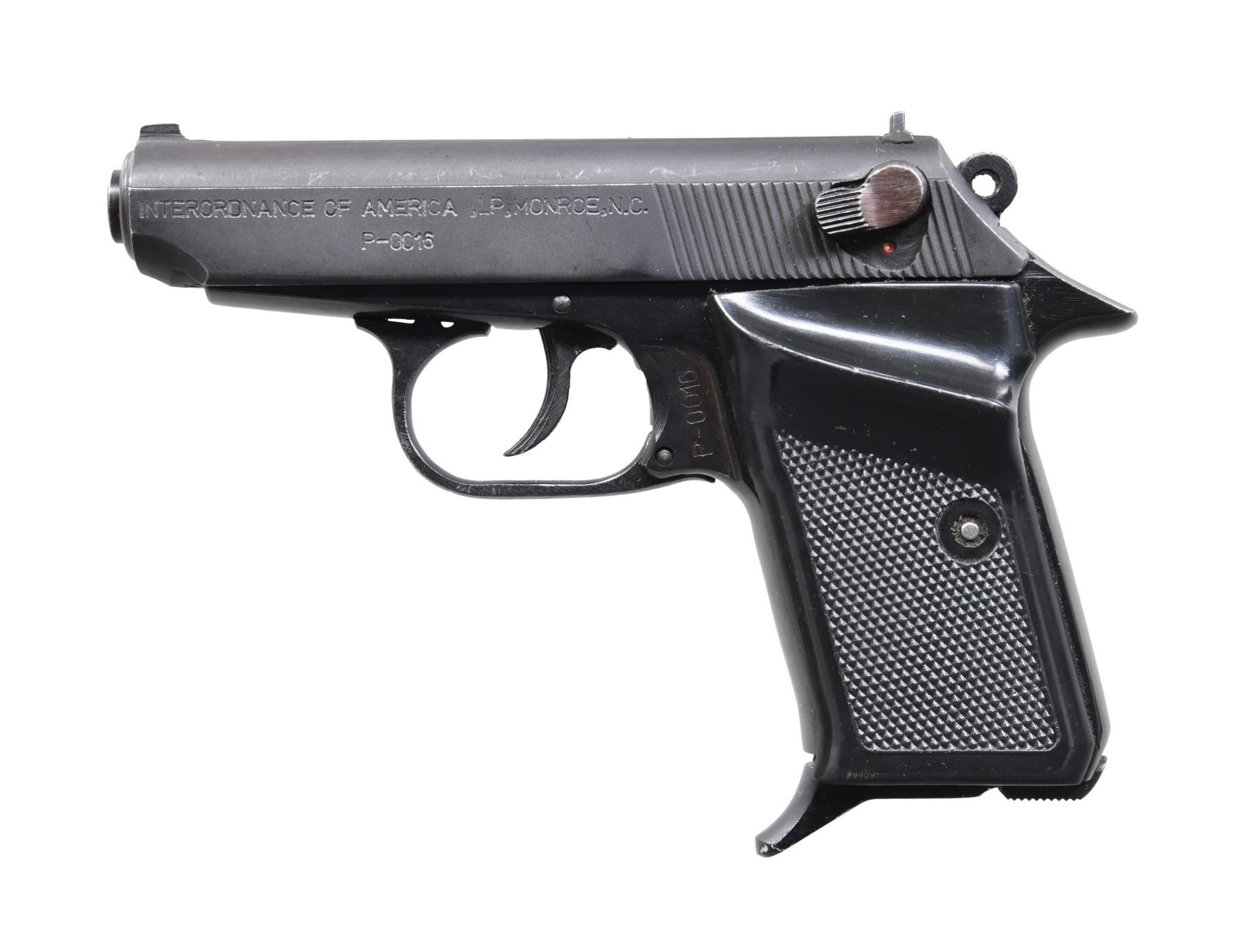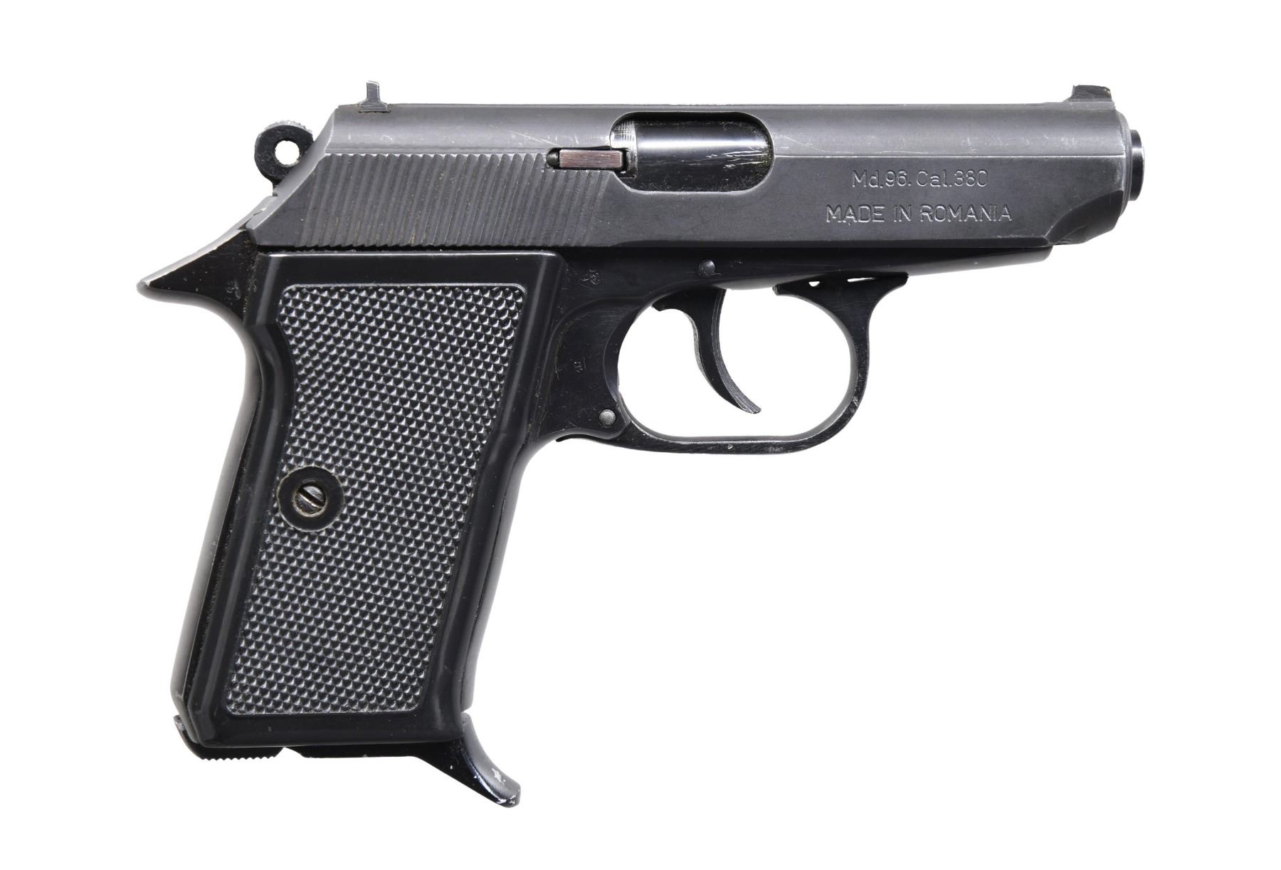 PISTOL. Cal. 380 ACP. S# P-0016. Bbl. 3 1/2". Model 96 semi-automatic pistol mfg. in Romania and imported by Interordnance of America. Left side of the slide is marked with Interordnance of America's importer information above the S#, with the model and cal. designations above "MADE IN ROMANIA" marked on the right. Frame and bbl. exhibit a blue finish, with the slide exhibiting a phosphate finish. Frame is mounted with 2-piece checkered black plastic thumbrest grips. Blade front sight, with square notch rear sight. Matching numbers are present on the frame and slide, with the mag. also matching via "0016" in electro-pencil. MAGS: one 7-rd. CONDITION: metal components retain the majority of their original factory finishes, exhibiting some light wear and thinning (primarily one edge), with scattered superficial handling marks present overall. Mirror chrome-lined bore, retaining well-defined rifling throughout. Grips show some superficial marks from handling and storage but otherwise remain sturdy and serviceable. (24-5483/MLW). MODERN. $100-200.