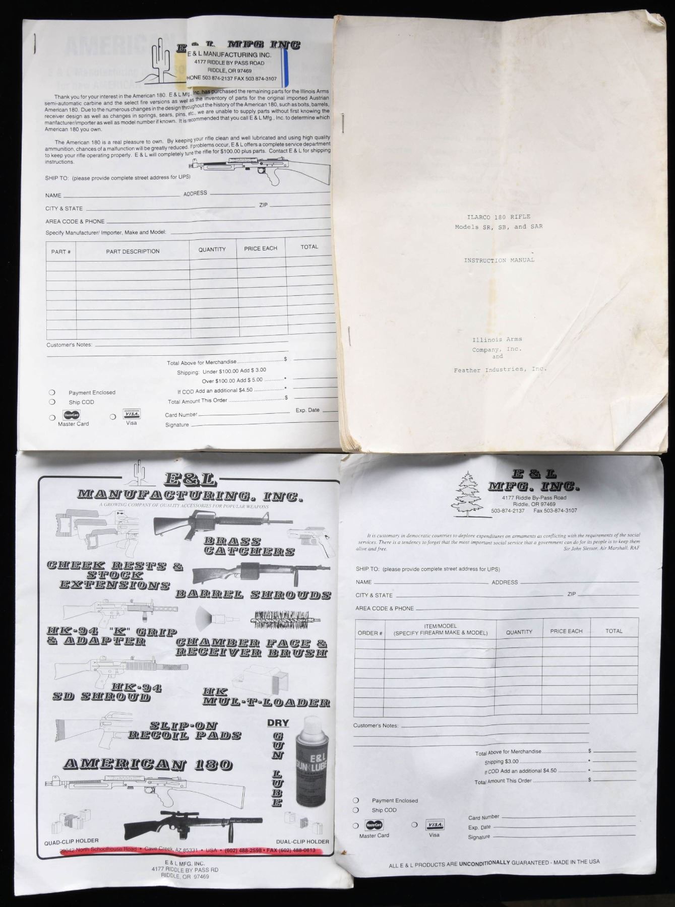 Lot of American 180 parts and accessories, including: 1) 1 steel mag. (square slot). 2) 1 clear plastic mag. 3) 1 loading tray. 4) 1 front sight assembly. 5) 1 furniture set consisting of a buttstock, pistol grip, and forend. 6) Illinois Arms 180 manual. 7) Black transit soft case. CONDITION: all very good, with some marks from handling and storage. PROVENANCE: Lifelong Collection of Terrence McCarty. (02-21821-14/MLW). $300-500.