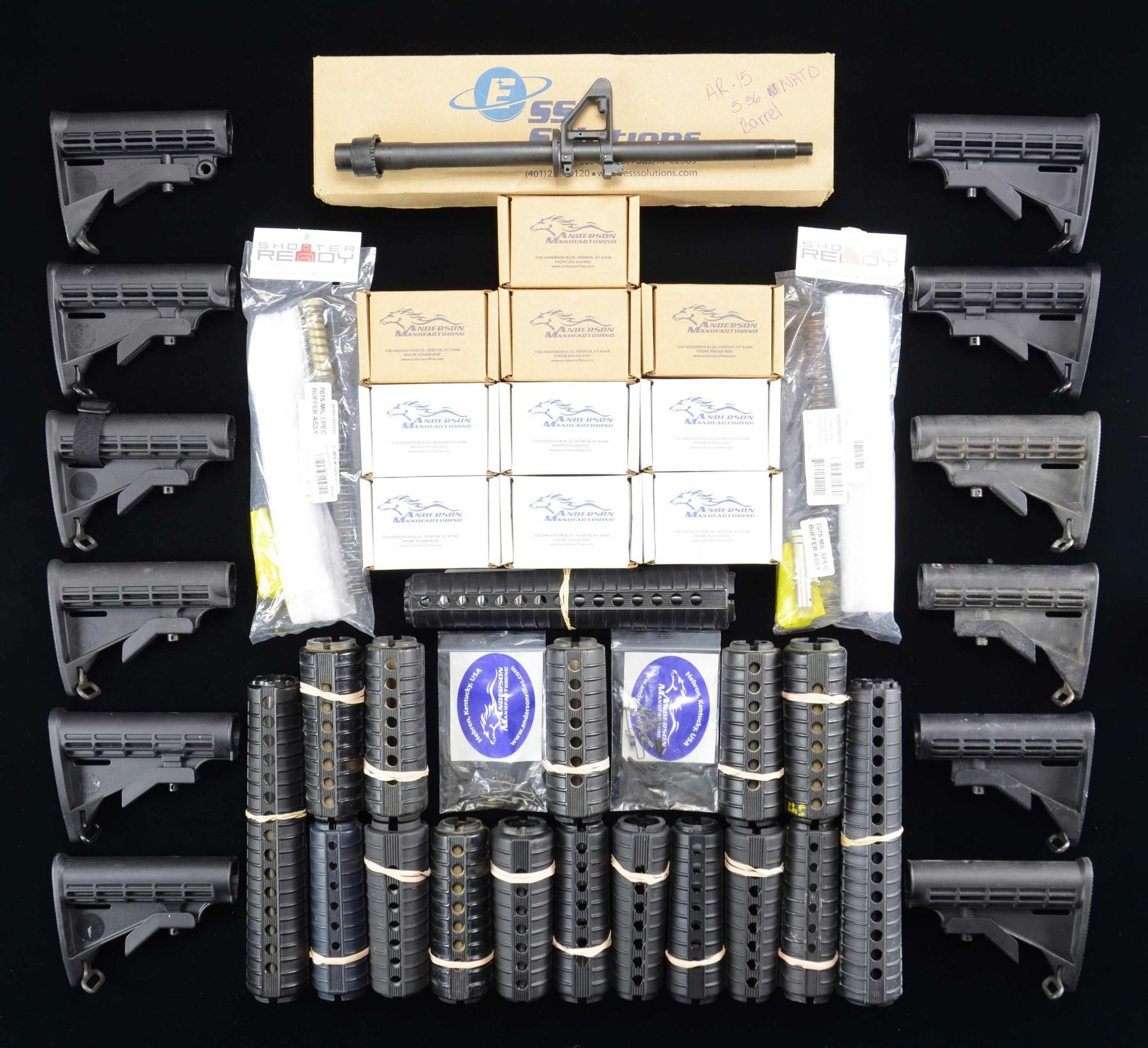 A grouping of AR-15 parts & accessories including the following: 16” 1/9 5.56 NATO Barrel 1; A2 Carbine Handguards 14 Sets; A2 Rifle Handguards 3 sets; CAR Plastic collapsible shoulder stocks 12; Lower Parts Kits (Anderson) 10; Flat Top Upper Receivers 13; Carry Handle Upper receivers 3; Carbine Buffer, Tube, Spring & Nut 11; Charging Handles 8; Complete bolt / Carrier 10; Flash Hiders 9; Ejection Port Cover Assemblies 5; Pistol Grips 11; Tear Drop Forward Assist Assembly 13; Tapered Delta Ring Assemblies 3; Spring Sets 6; BUIS Sets (Front & rear) 3; CONDITION: Parts vary in condition from as new in factory packaging to used. Most are as new without evidence of ever being installed. (02-23231/JZ). $900-1,400.