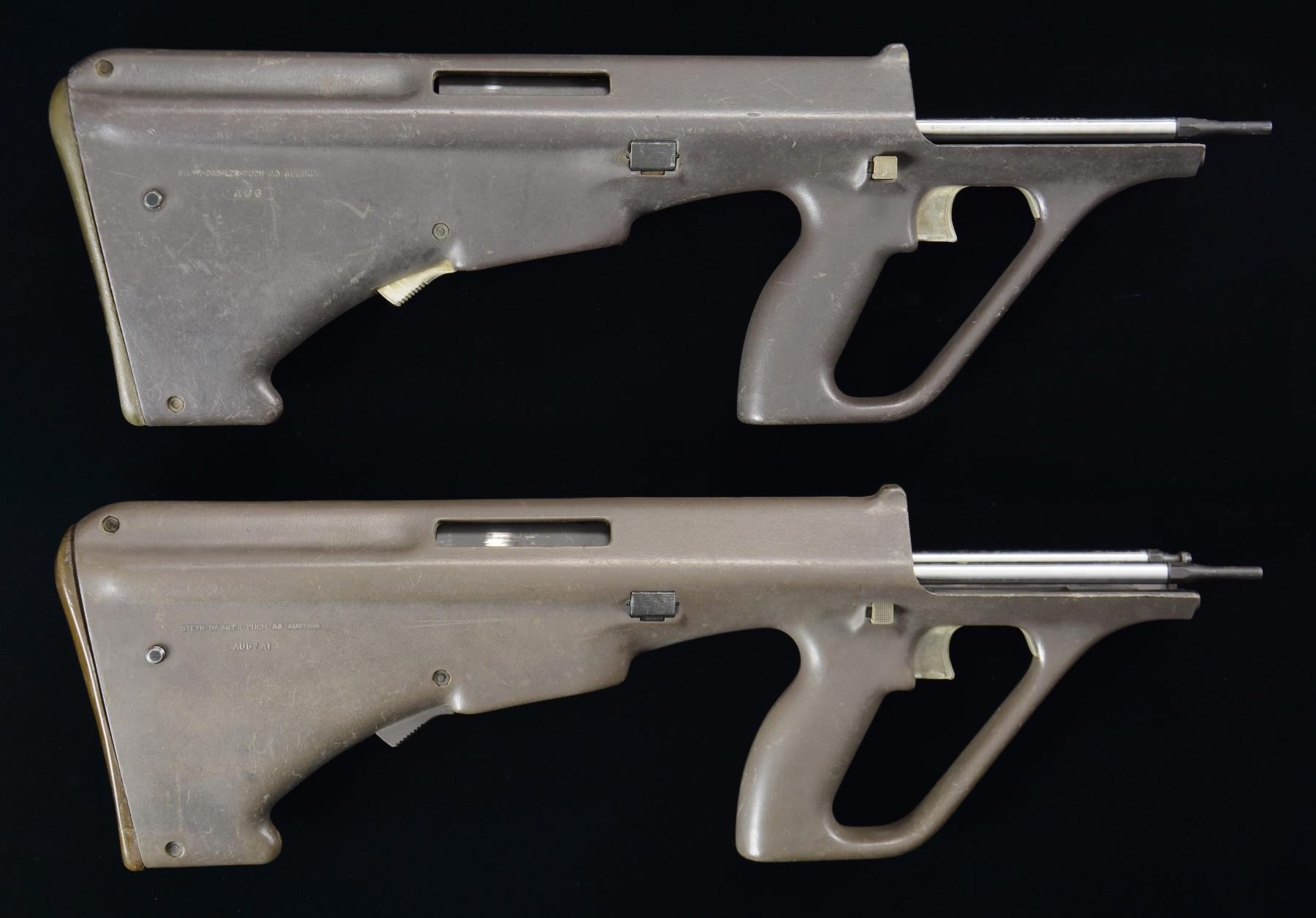 PACKS & BOLT CARRIERS WITH BOLTS. 2 Steyr AUG full auto replacement stocks w/ trigger group & bolt carrier w/ right-hand eject, .223 bolts. OD green. Complete w/ butt cover & pin / sling swivel. CONDITION: Stocks exhibit typical dings & old unit marks. All internals appear functional. PROVANANCE: Lifelong Collection of Terrence McCarty. (02-21800-10/JZ). $400-800.