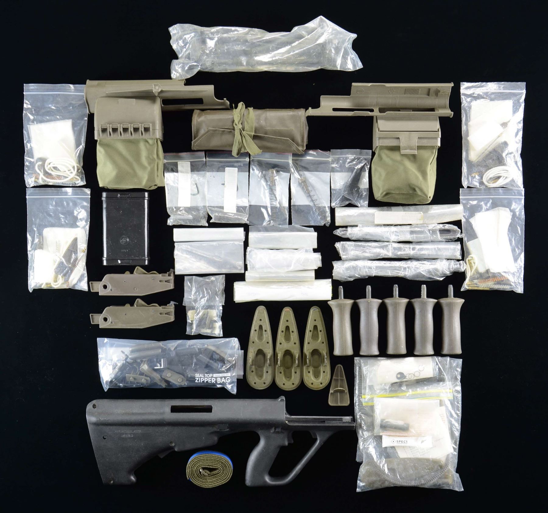 An assortment of Steyr Aug parts, pieces & accessories including the following; 1 black chassis, 2 OD green semiautomatic hammer packs, 5 OD green foregrips, 4 bolts (3 left side & 1 right side), 1 AUG spare parts kit, 1 bipod, 7 magazine floorplates, followers & spring guides, 4 picatinny scope mounts, 2 OD green brass catchers, 1 rubber cleaning roll, 4 field cleaning kits, & 3 OD green butt plates. CONDITION: parts vary in condition from used to new, all appears serviceable. PROVANANCE: Lifelong Collection of Terrence McCarty. (02-21800-11/JZ). $400-800.