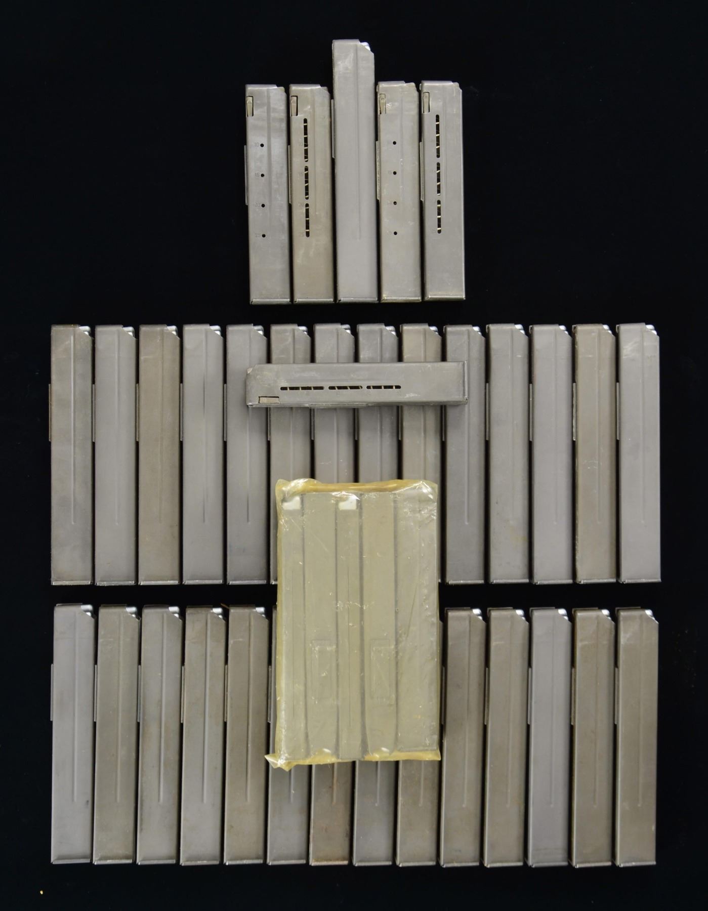Lot of 39 Steyr MPi 69/81 mags. including: 1) 34 32-rd. mags. 2) 5 25-rd. mags. CONDITION: most mags. remain very good overall, with some superficial marks from handling and storage. Several mags. exhibit mild to moderate wear, but otherwise remain sturdy and serviceable. PROVENANCE: Lifelong Collection of Terrence McCarty. (02-21821-5/MLW). $500-1,000.