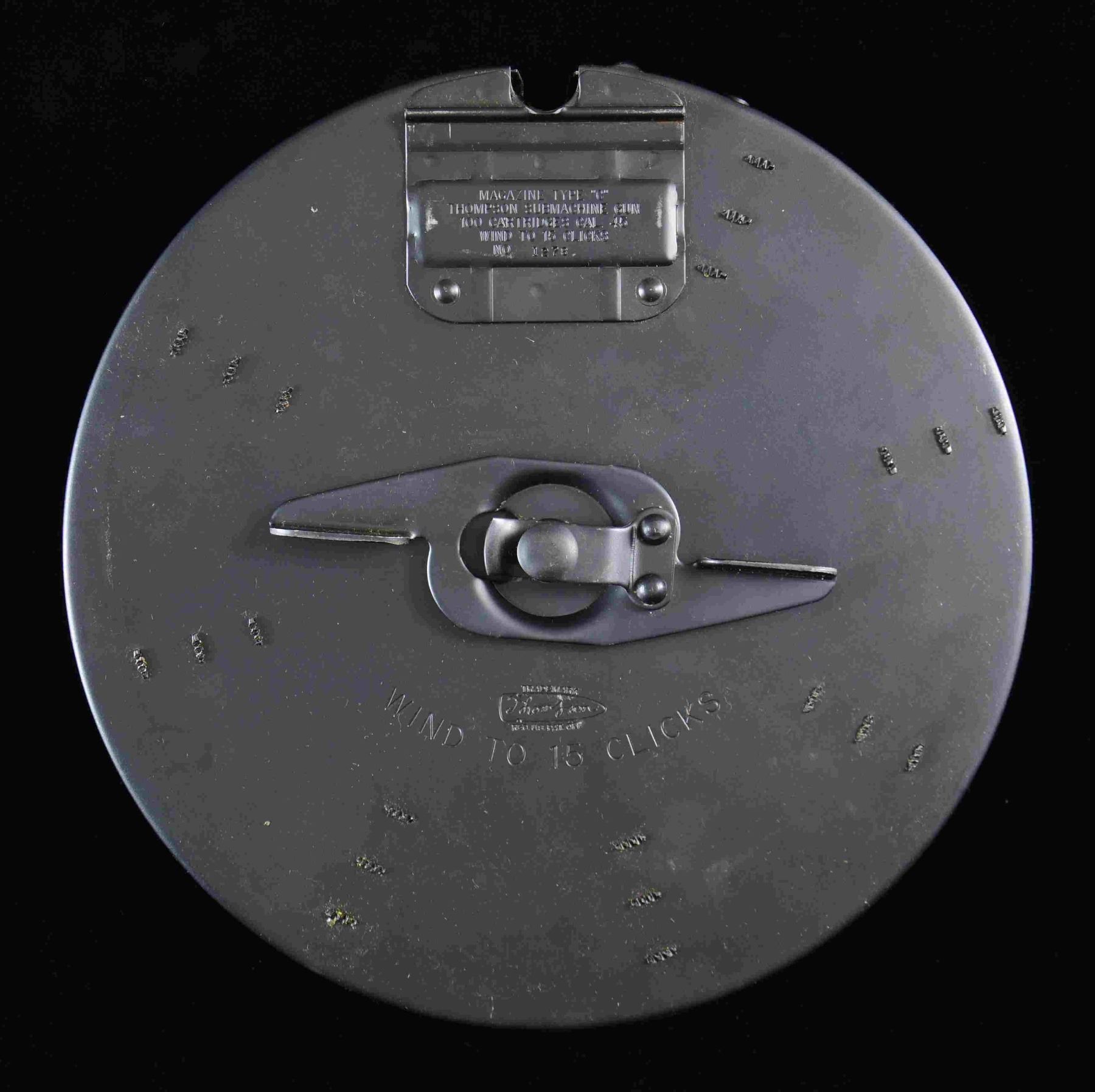 MAGAZINE WITH BOX & MANUAL. 100-rd. Thompson submachine gun "C" Drum mfg. by Auto Ordnance. Front cover data plate is marked "MAGAZINE TYPE "C"/ THOMPSON SUBMACHINE GUN/ 100 CARTRIDGES CAL. 45/ WIND TO 15 CLICKS/ NO. 1278", with the rear data plate reading "AUTO ORDNANCE CORP./ NEW YORK/ REGISTERED IN THE/ U.S. PATENT OFFICE". Cover is marked with the Thompson bullet trademark logo above "WIND TO 15 CLICKS". Exterior exhibits a matte blue finish. UNATTACHED ACCESSORIES: unmarked cardboard box. CONDITION: excellent, with metal components retaining the vast majority of their original factory blue finish, exhibiting some small scattered spots of light wear, as well as some scattered superficial handling marks overall. Box shows exterior wear and is held close via a rubber band. PROVENANCE: the lifelong collection of Terrence McCarty. (02-21797-6/MLW). $400-800.