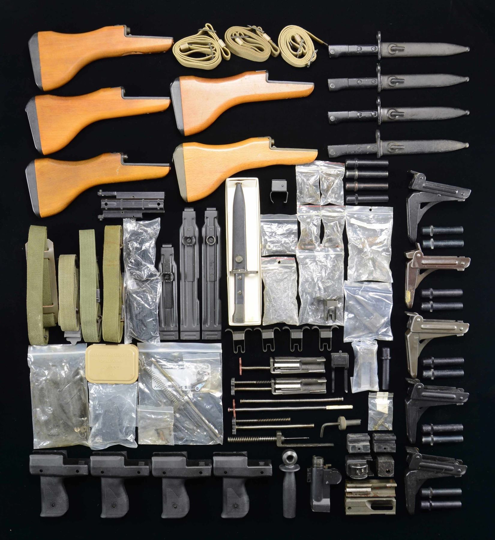 Large grouping of Uzi parts & accessories including the following: 5 folding shoulder stocks, 5 hardwood shoulder stocks, 5 original bayonets, 9 Mini-Uzi bolts, 1 Uzi Carbine bolt, 1 Uzi SMG bolt, 2 cut receiver pieces including the front & rear sight assemblies (no center section), 1 original barrel mounted spotlight, 1 plastic grip furniture set consisting of pistol grip panels & front handguards, 16 dummy 3.5” display SMG barrels, 4 vertical front pistol grips, 2 carbine top covers, 1 Mini-Uzi top cover, 2 Uzi front sight adjustment tools, 1 rear sight adjustment tool, & several other small parts & accessories. CONDITION: Parts vary from as new to used, and in cases such as the receiver sections, removed from functional firearms. PROVANANCE: Lifelong Collection of Terrence McCarty. (02-21804-10/JZ). $1,200-2,400.