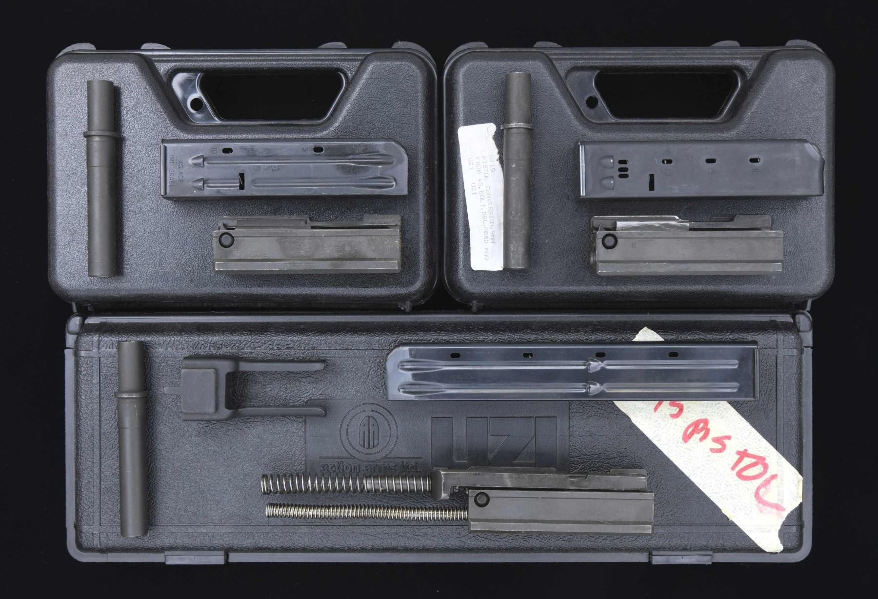 Grouping of 3 Uzi bolt caliber conversion kits, each in a black plastic case. 1 kit is for the Uzi pistol changing from 45 acp to 9mm. Kit includes 1 4.5" barrel, bolt & 20 rd. magazine. 1 kit is for the Uzi Pistol, changing from 9mm to 45 acp. Kit includes 4.5" barrel, bolt & 10 rd. magazine. 1 kit appears to be for an SBR Uzi Carbine, from 9mm to 45 acp. Kit includes 4.5" barrel, semiautomatic, closed bolt system, 16 rd. magazine & loading tool. CONDITION: All kits appear to be unused, w/ some parts coated in light grease upon arrival. Bores are all bright w/ strong rifling. PROVANANCE: Lifelong Collection of Terrence McCarty. (02-21804-3/JZ). $600-900.