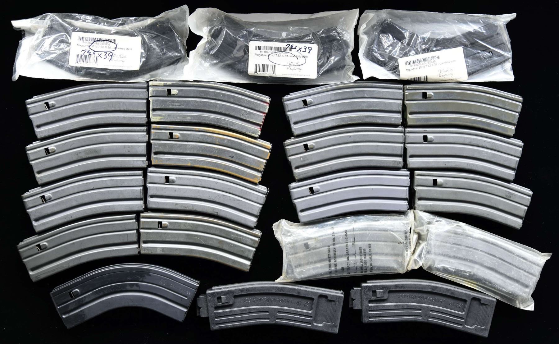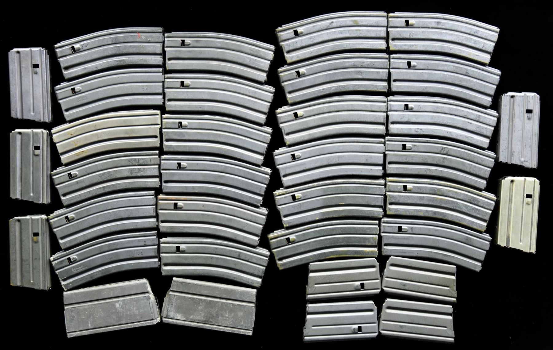 Grouping of magazines including the following: 40 aluminum 30 rd. .223 AR-15 mags.; 4 steel 30 rd. 7.62x39 AR-15 mags.; 9 aluminum 20 rd. .223 AR-15 mags.; 2 steel .308 M1A mags.; 2 Chiappa 30 rd. .22lr mags. UNATTACHED ACCESSORIES: 2 green steel military ammo cans. CONDITION: mags range from new to used. All appear outwardly functional. (02-23233-4/JZ). $500-800.