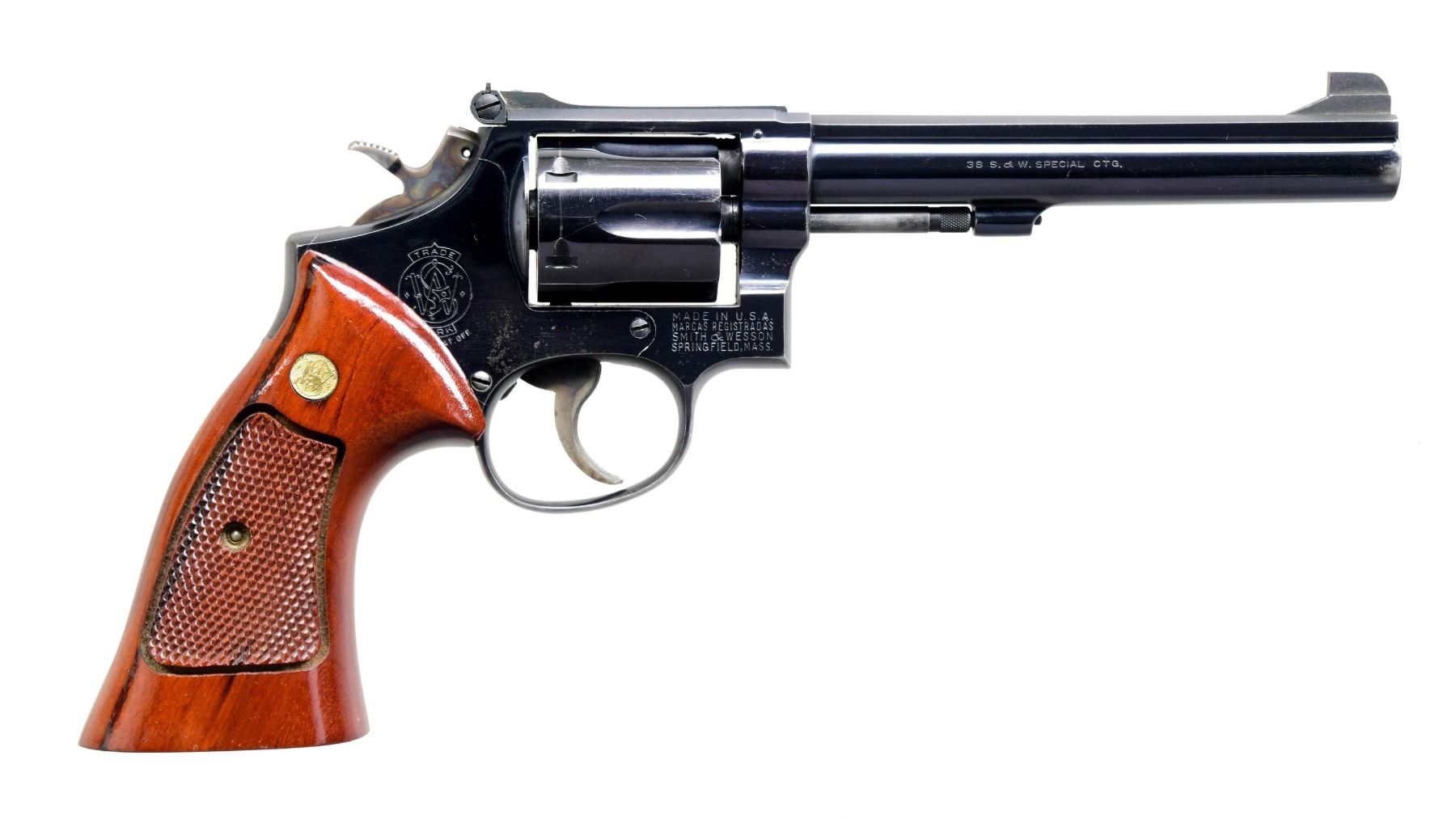Cal. 38 Spl. S# K527640. Bbl. 6", pinned. Patridge front sight. Adjustable square notch rear sight. Mfg. 1963. Blued finish with case-colored trigger and hammer. Checkered walnut target grips with silver S&W medallions. UNATTACHED ACCESSORIES: factory box without labels. CONDITION: grips have added varnish with some light handling marks. Trigger and hammer retain most of their case colors with some operational wear and light oxidation. Balance of metal retains 85% blue with some light oxidation, scattered edge wear, and fading. Action appears to function properly when hand-cycled. Very good+ bore. (24-3839/MJC). CURIO. $500-800.