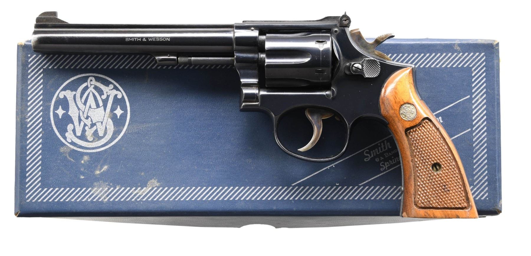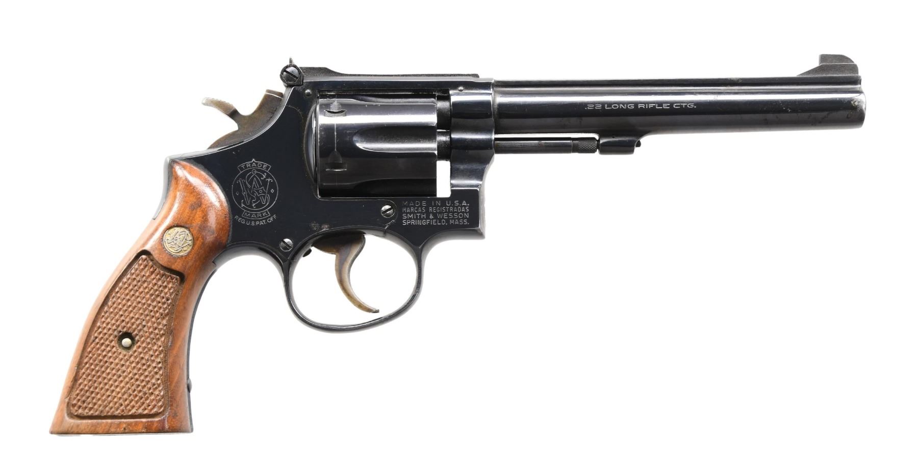 Cal. 22 LR. S# 5K25286. Bbl. 6". Patridge front sight. Adjustable square notch rear sight. Mfg. 1973. Blued finish with case-colored trigger and hammer. Unnumbered checkered walnut magna grips with silver S&W medallions. UNATTACHED ACCESSORIES: matching-numbered factory box with paperwork. CONDITION: grips show a couple moderate chips and some scattered handling wear. Trigger and hammer retain much of their case colors with some light fading and operational wear. Balance of metal retains 90% original blue with scattered edge wear and some small spots of light oxidation. Action functions properly when hand-cycled. Bright, very good+ bore. (24-3863/MJC). CURIO. $500-750.
