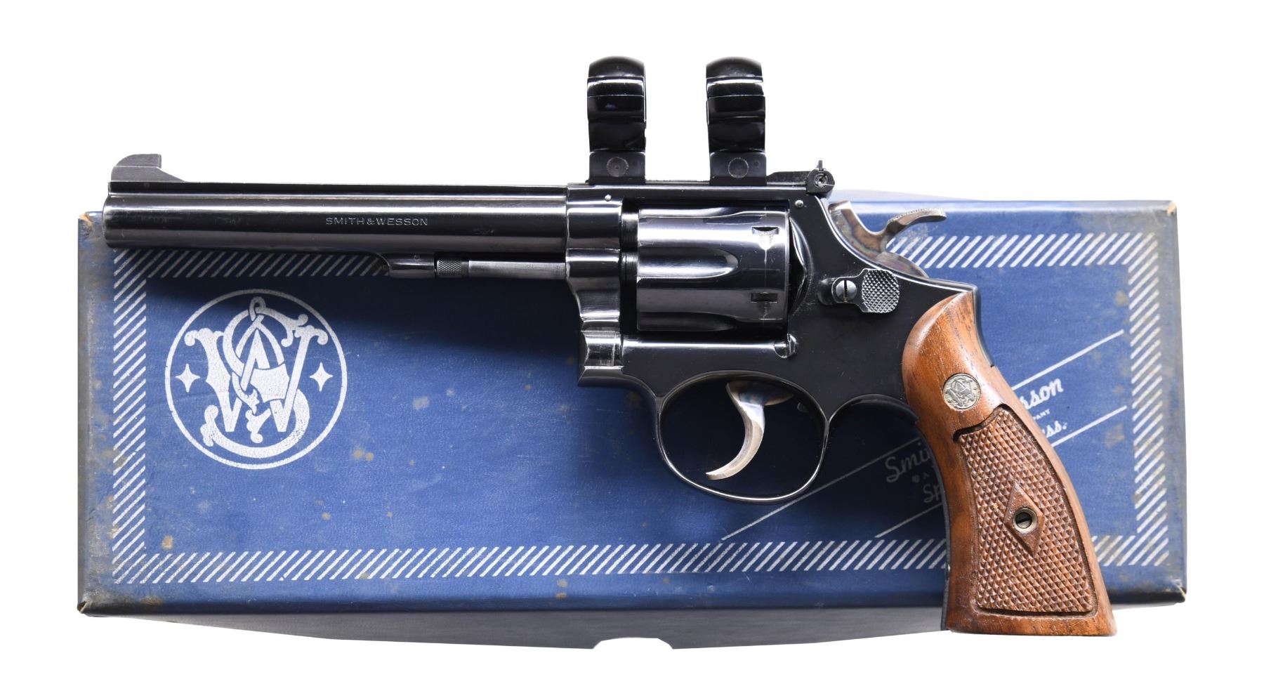 Cal. 22 LR. S# 3K4939. Bbl. 6", pinned. Patridge front sight. Adjustable square notch rear sight. Top of the frame has two scope rings attached. Mfg. 1973. Blued finish with case-colored target trigger and hammer. Checkered walnut grips with silver S&W medallions and mismatched right panel. UNATTACHED ACCESSORIES: matching-numbered factory box with manual. CONDITION: grips show a few light handling marks. Trigger and hammer retain most of their case colors with some operational wear and light fading. Balance of metal retains 95% original blue, with some scattered edge and operational wear most notable on the bottom of the trigger guard. Action functions properly when hand-cycled. Bright, near excellent bore. (24-5160/MJC). CURIO. $600-900.