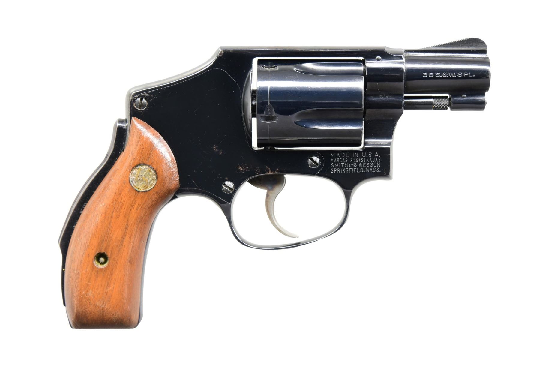 Cal. 38 Spl. S# L4259. Bbl. 2", pinned. Ramped, serrated blade front sight. DAO revolver with grip safety and 5-shot cyl. Mfg. 1971-1974. Blued finish with case-colored trigger. Smooth walnut grips with stamped matching right panel and silver S&W medallions. CONDITION: grips have an added finish with scratches and handling marks. Trigger retains most of its case colors with some light oxidation and operational wear. Balance of metal retains 70% blue with scattered edge wear, light fading, and some light oxidation. Action functions properly when hand-cycled. Very good, bright bore. (24-3865/MJC). MODERN. $400-600.
