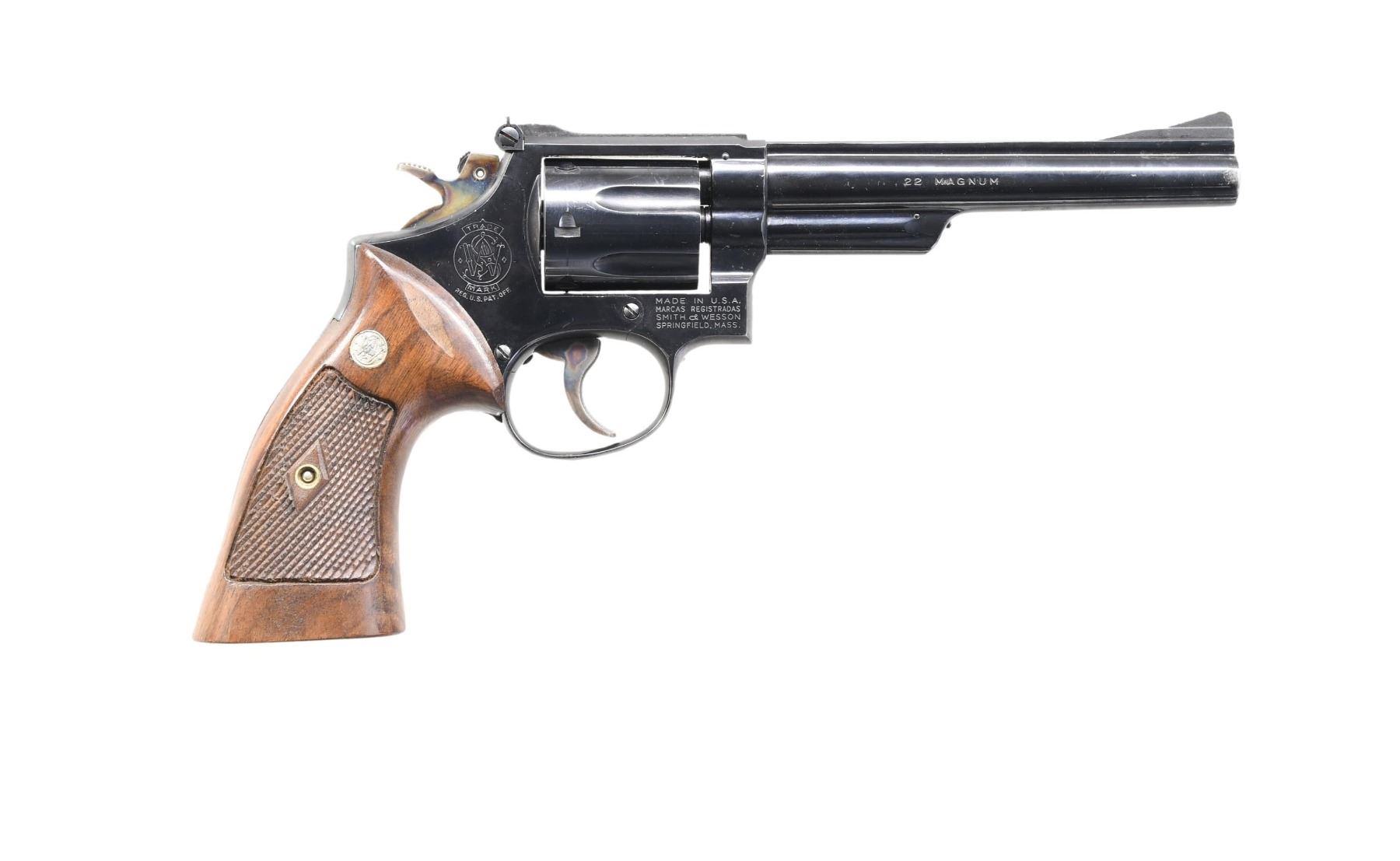 Cal. 22 Rem. Jet. S# K462815 (mfg. 1961). This Smith & Wesson Model 53 features a blued finish with a 6-inch barrel, adjustable rear sight, and ramp front sight. The frame is a K-Frame configuration, and the cylinder is fluted, holding six rounds. The grips are Target checkered walnut with Smith & Wesson medallion. CONDITION: Overall condition is very good with approximately 90% of the original blued finish remaining on the barrel and frame with numerous marks. The grips are in very good condition with one large worn spot on right panel. The bore is bright with sharp rifling. (24-4407/MD). CURIO. $500-800.
