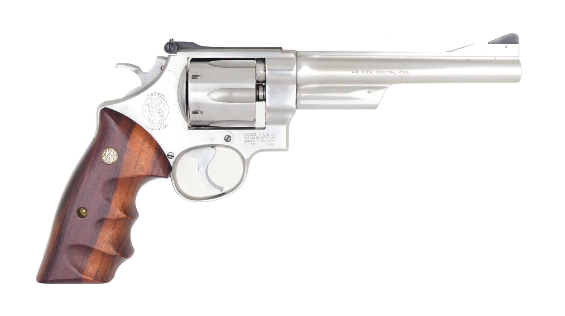 Cal. 44 Spl. S# AHB1963. Bbl. 6 1/2". Ramped blade front sight. Adjustable square notch rear sight. Stainless finish. Finger groove Goncalo Alves target grips with silver S&W medallions. UNATTACHED ACCESSORIES: factory box, without end labels, with paperwork. CONDITION: grips show a couple light dings and some handling marks. Metal shows some light oxidation specks, a drag line on cyl., and some scattered handling wear. Action functions properly when hand-cycled. Very good+, bright bore. (24-3903/MJC). MODERN. $500-800.