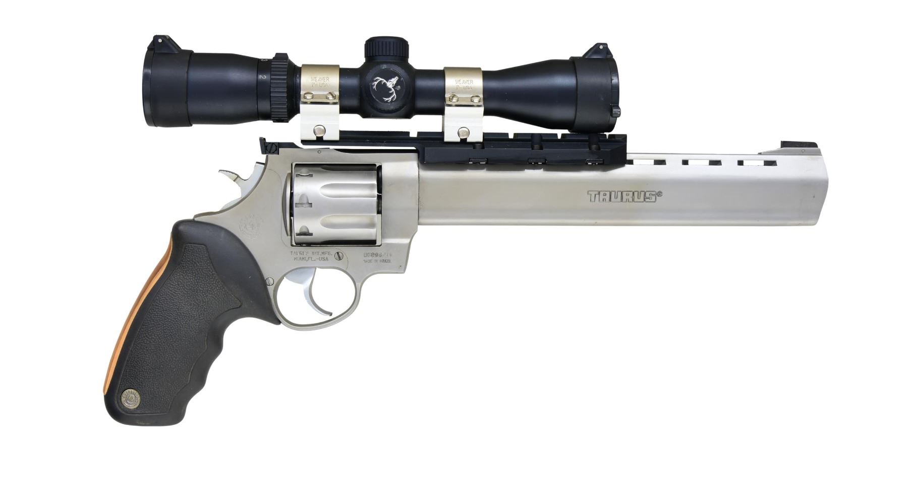 FACTORY BOX. Cal. 22 Hornet. S# UG896216. Matte stainless steel finish with 10" barrel. Equipped with a Tasco 2x-6x33 scope with duplex reticle on a Taurus Raging Bull 8 3/8" rail by silver Weaver 1" rings; adjustable rear sight and blade front sight. Rubber grip. An 8-round fluted cylinder. UNATTACHED ACCESSORIES: factory box. CONDITION: excellent, with approximately 95% finish remaining on the barrel and frame. Grips are in near excellent condition. Bore is bright with sharp rifling. (24-4416/MD). MODERN. $500-700.