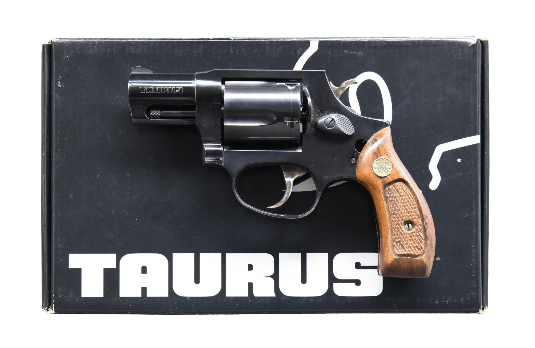MATCHING FACTORY BOX. Cal. 357 Mag. S# DS39318. Bbl. 2". Model 605 double action revolver mfg. in Brazil by Taurus and imported by Taurus International. Left side of the bbl. is marked "TAURUS", with the cal. designation and S# marked on the right. Right side of the frame is marked with the Taurus logo, followed by Taurus' importer information, as well as the S# above "MADE IN BRAZIL". Metal components exhibit a blue finish overall, save for on the trigger and hammer, which exhibit a case color hardened finish. Frame is mounted with 2-piece S&W medallion checkered wood grips. Blade front sight, with square frame notched rear sight. UNATTACHED ACCESSORIES: Hunter brown leather holster, as well as a matching factory box containing original factory grips. CONDITION: excellent, with metal components retaining bountiful amounts of their original factory finishes, exhibiting a few superficial handling marks, as well as a light dragline on the cyl. Mirror bore, exhibiting well-defined rifling throughout. Grips show some wear, as well as a few scattered marks from handling and storage, but otherwise remain sturdy and serviceable. Holster is very good overall. Box shows some light exterior wear from handling and storage but otherwise remains sturdy and serviceable. (24-5496/MLW). MODERN. $200-300.